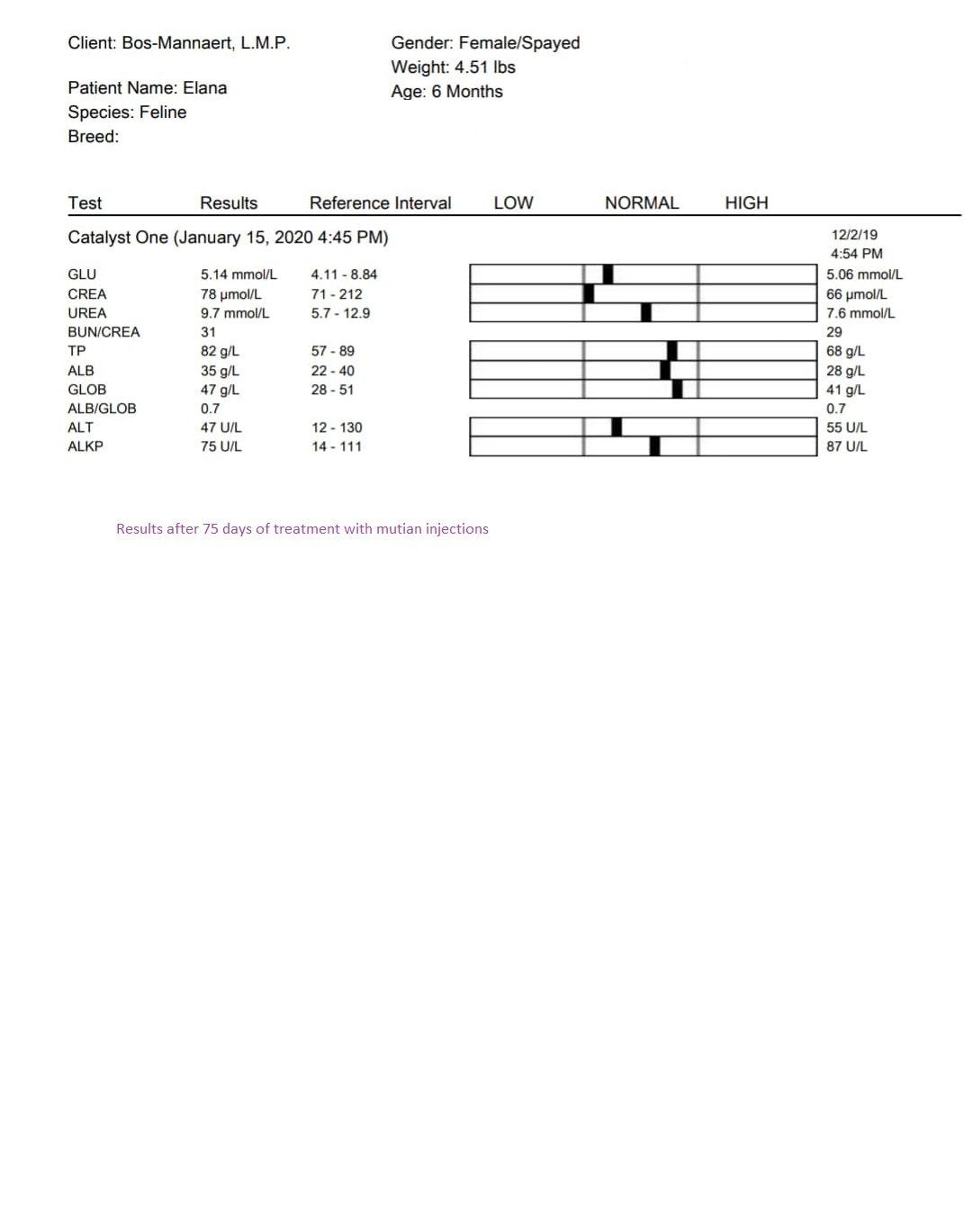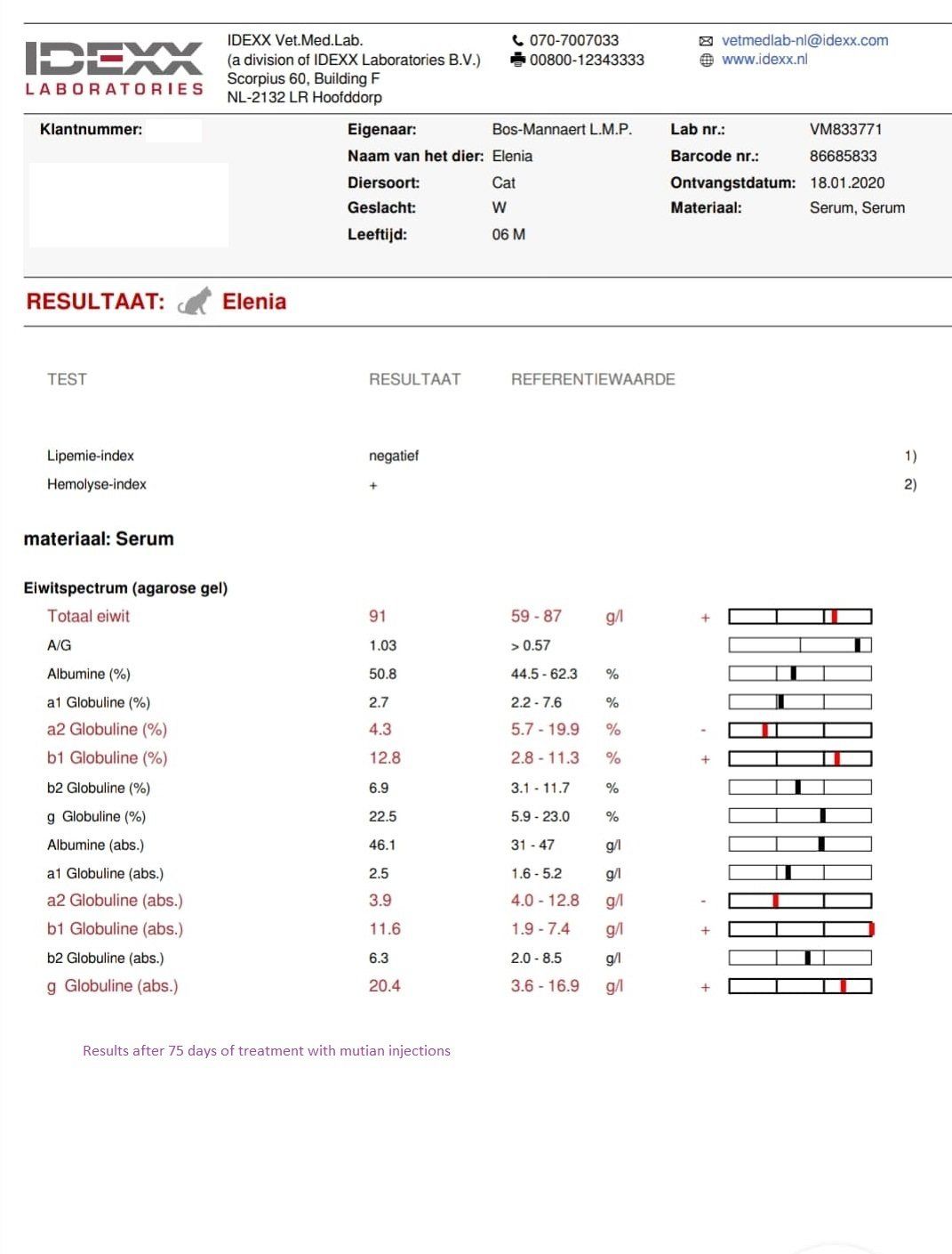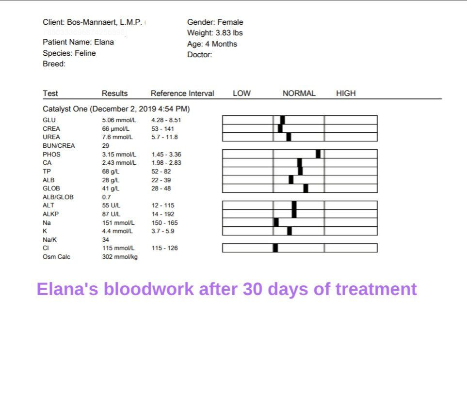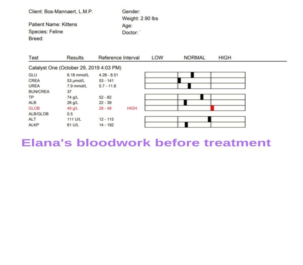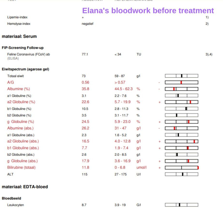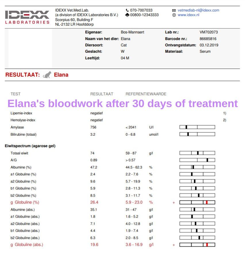 Monday, December 2, 2019 - day 31 Today the first blood sample was scheduled after the start of the treatment. It is expected that the values could be even worse than before. This is also reflected in the studies. From 5 weeks of treatment, an increasing line can generally be seen in the blood values. Elana now weighs 1,740 kg and has been given a small sedation so that the blood draw went smoothly. A number of values are determined in the clinic itself. The rest will be determined by the lab, of which we will receive the results later. 22.15 Mutian GS-441524 0.51 ml 1.740 kg WOW!! We are so happy with these first results. The greatest improvement usually only occurs in the last 30 days of treatment. Elana is doing great. It is now our fingers crossed that the lab results may also positively surprise us.