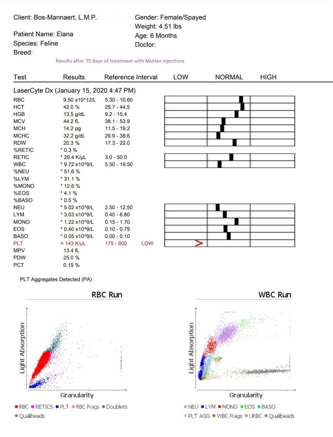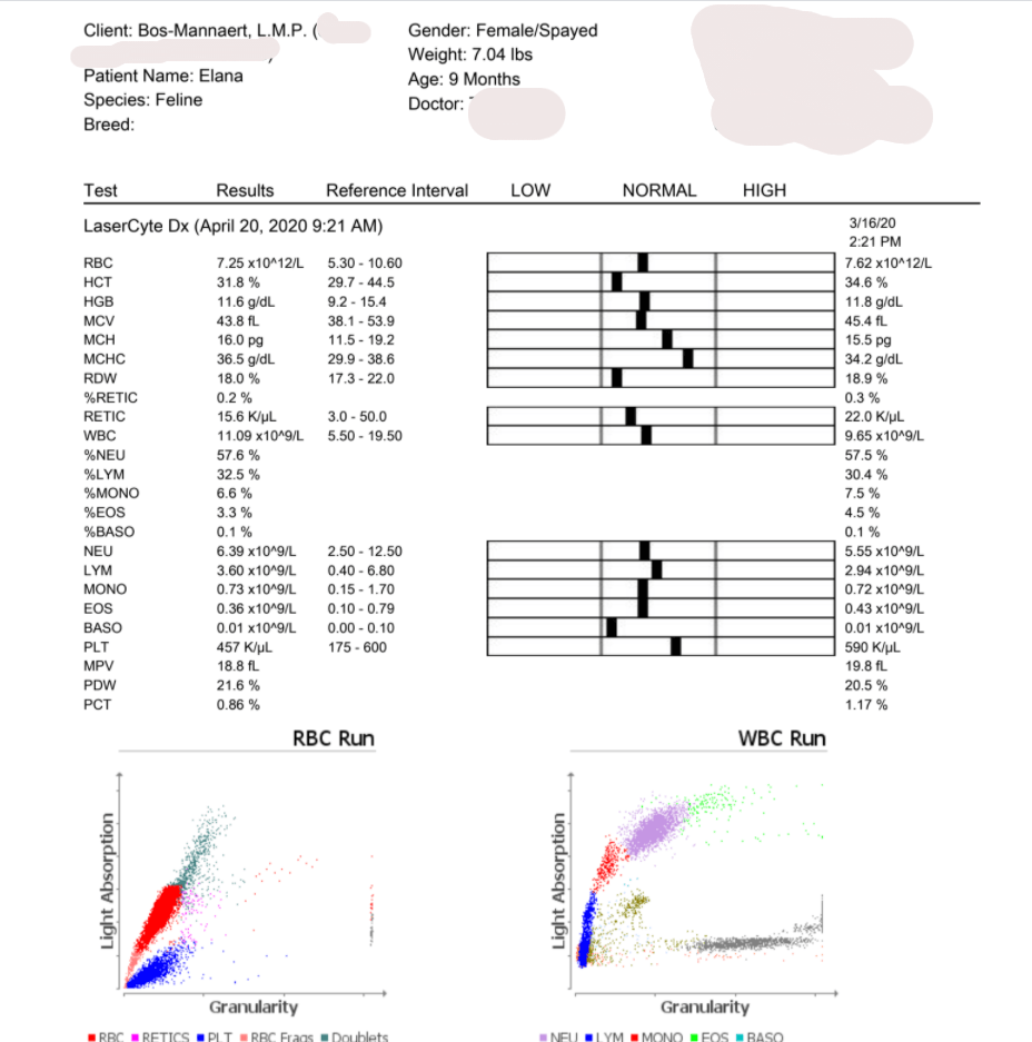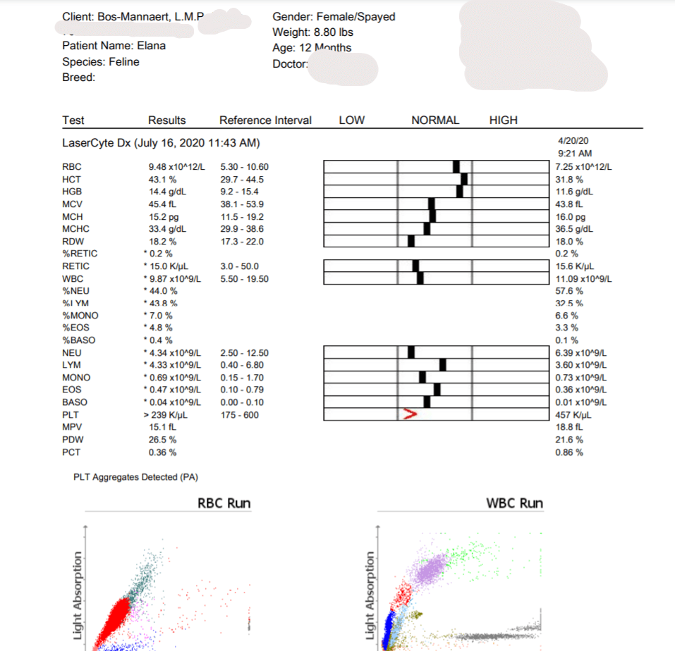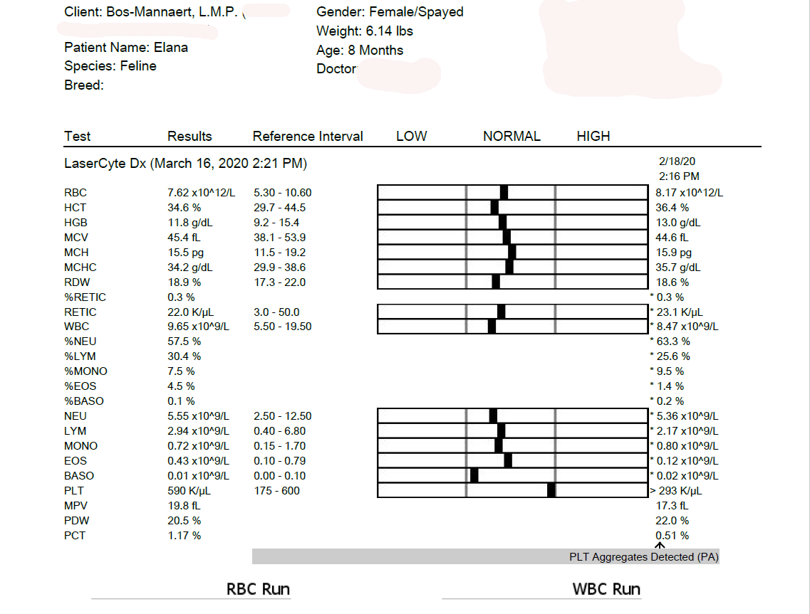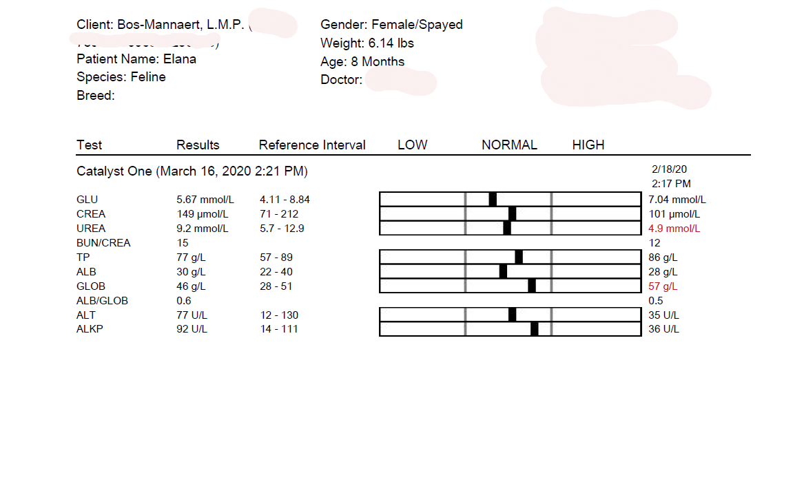 Monday, December 2, 2019 - day 31 Today the first blood sample was scheduled after the start of the treatment. It is expected that the values could be even worse than before. This is also reflected in the studies. From 5 weeks of treatment, an increasing line can generally be seen in the blood values. Elana now weighs 1,740 kg and has been given a small sedation so that the blood draw went smoothly. A number of values are determined in the clinic itself. The rest will be determined by the lab, of which we will receive the results later. 22.15 Mutian GS-441524 0.51 ml 1.740 kg WOW!! We are so happy with these first results. The greatest improvement usually only occurs in the last 30 days of treatment. Elana is doing great. It is now our fingers crossed that the lab results may also positively surprise us.
