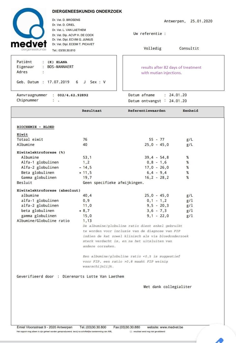 Thursday January 16, 2020 - day 76 Elana is doing well. The above video was made today (16-01-2020) on day 76 22.15 Mutian GS-441524 0.62 ml Friday 17 January 2020 - day 77 22.15 Mutian GS-441524 0.62 ml Saturday 18 January 2020 - day 78 22.45 Mutian GS -441524 0.62 ml Sunday 19 January 2020 - day 79 23.00 Mutian GS-441524 0.62 ml Monday 20 January 2020 - day 80 22.15 Mutian GS-441524 0.62 ml Tuesday 21 January 2020 - day 81 22.30 Mutian GS-441524 0.62 ml Wednesday January 22, 2020 - day 82 38.8 degrees (for control) 22.15 Mutian GS-441524 0.62 ml Thursday January 23, 2020 - day 83 Because the lab result of 75 days did not match the results of the clinic itself we decided to take blood again and to choose another lab. This way we know for sure whether Elana is indeed doing well and if we can stop after the 84 days of injections. 22.15 Mutian GS-441524 0.62 ml Friday January 24, 2020 - day 84 !!!! The day we have been working towards for 12 weeks. The date that seemed endlessly far away but we have now made it. After the strange result of 75 days, I am somewhat reassured with the 2nd blood test that we had done. The values just look good. Elana behaves normally and there is nothing else to notice about her. Now we enter the exciting next 12 weeks, namely the "monitor" period. 22.15 Mutian GS-441524 0.62ml