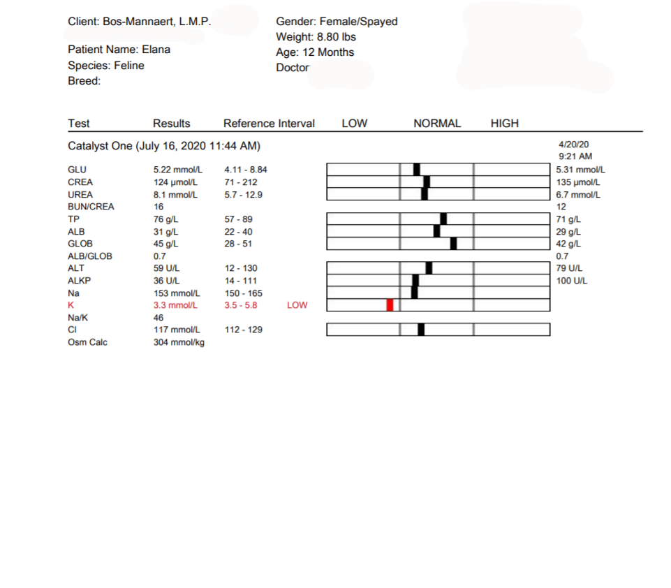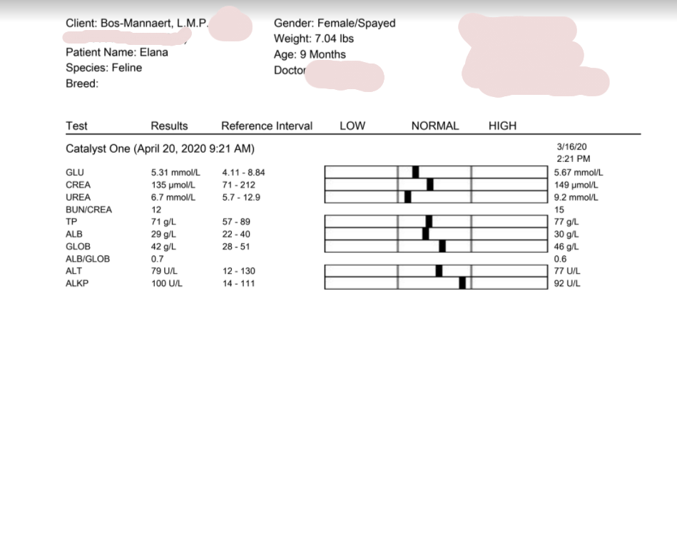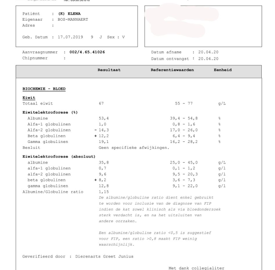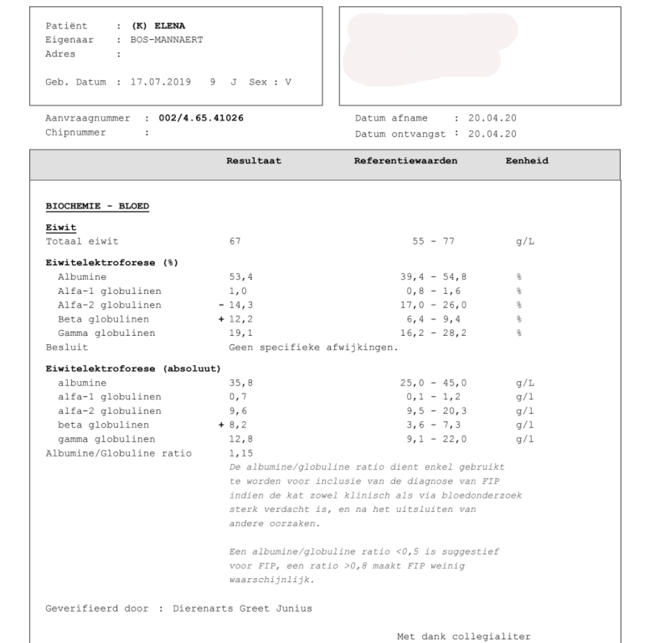 The results of day 75 were not quite as we had hoped. The 2 left results are tests done in the clinic. These are completely fine. (The PT on the result is different because of the way the blood is drawn) The right result is from the lab. This is of course slightly more accurate, but we cannot explain the deviations. The differences between the 2 tests are huge. At FIP we naturally look at the overall picture and specifically at A/G ratio, proteins, albumin & globulin values.
