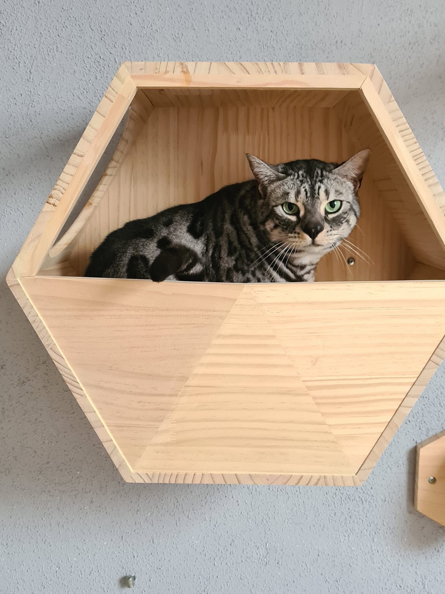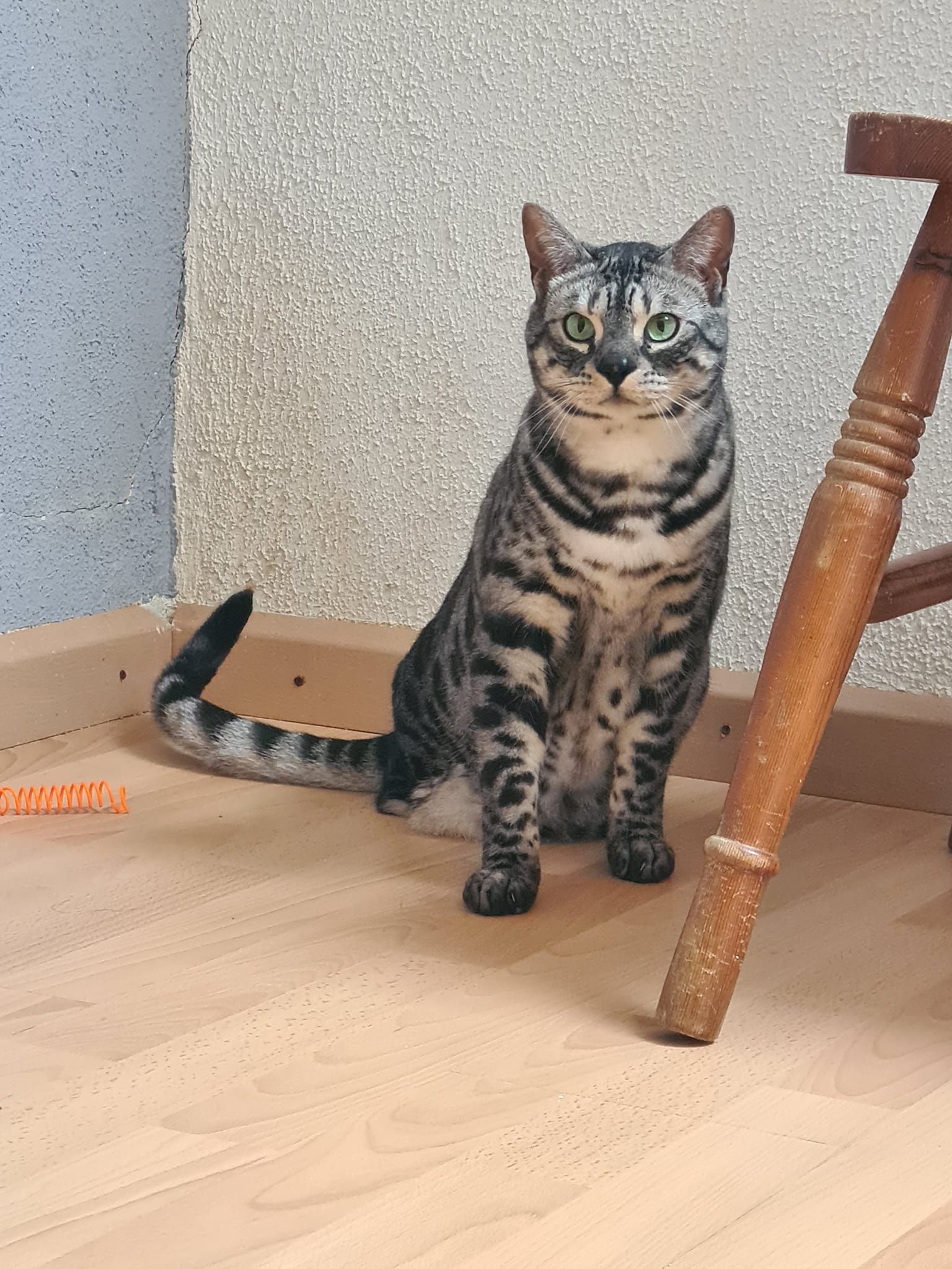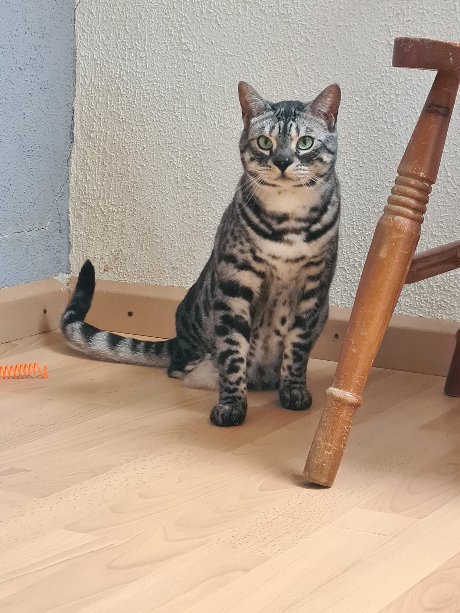 Unlucky Flint with 3 legs... January 2023 I found Flint in the cat run. He was hanging upside down with his leg stuck in a piece of fabric from a hanging basket. He had gotten stuck and started spinning around, which cut off the blood circulation. Quickly released and immediately taken to the vet where everything was taken care of in the hope that we could save his leg. Unfortunately, after about a week we still had to decide to amputate his leg. 2025Flint is doing great, is a happy tomcat, always satisfied and a huge cuddly bear. Flint plays nicely in the kitten room and helps with raising kittens when there are kittens.