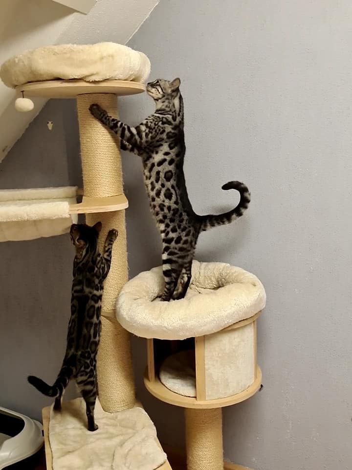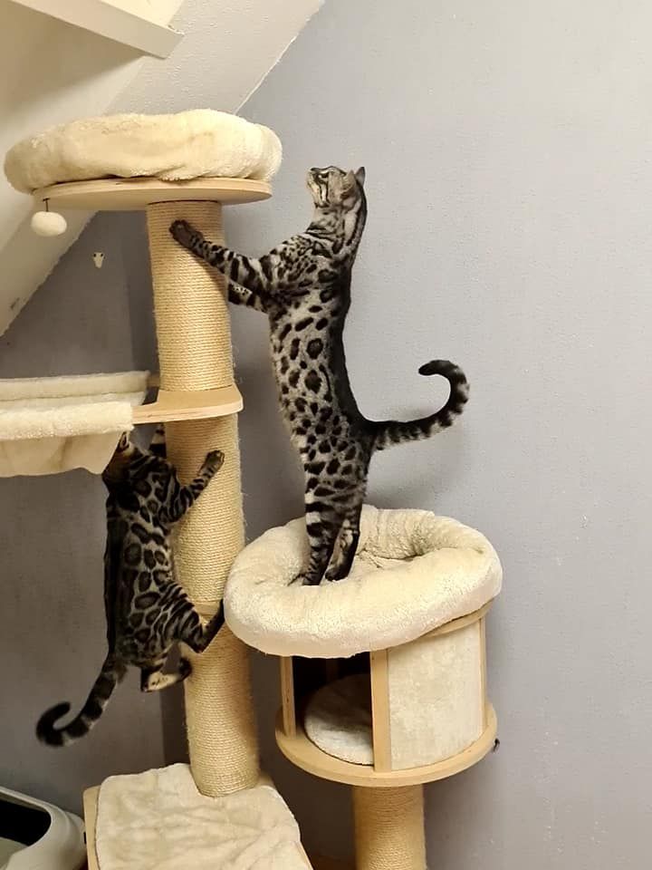 Male cat 13-12-2018 Black silver tabby spotted Father One in a Million Rare Bright Topaz Mother One in a Million It Just Started with a Whisper Flint was castrated for health reasons at the age of 4 weeks and had surgery on his urinary tract. Since then he has been living as a "kitten". Due to serious blockages by crystals / stones, he had a penis amputation in which a completely new "opening" was created. Flint has since been operated on several times and treated intensively. The opening that was created has grown closed again a number of times, making new surgery necessary. Flint is now 13 weeks old (14-3-2019). Given the circumstances, he is doing well, of course we will continue to keep a close eye on him now and in the future. As long as he is growing, there is a possibility that it will grow closed again. We are grateful to our vet for daring to take on the challenge regarding the operation. Normally we would have had to put Flint to sleep when he was 4 weeks old. Such an operation is already a challenge on an adult animal, let alone on a kitten of only 400 grams. The chance of success was incredibly small, but we had nothing to lose / no more choices and are super happy with the result. Flint also owes his pedigree name Flintstone to them. At the practice, Flint was affectionately called Flintstone. Because of the long road we have walked, the tears that have flowed, the worries we have had and the great bond that has been created, Flint will continue to live with us as a spoiled house Bengal. It is now July 2019 and fortunately Flint is doing super well! Flint is growing like a weed and has not had any unpleasant procedures to date. Finally, since he was about 4 months old, we have really been enjoying him.