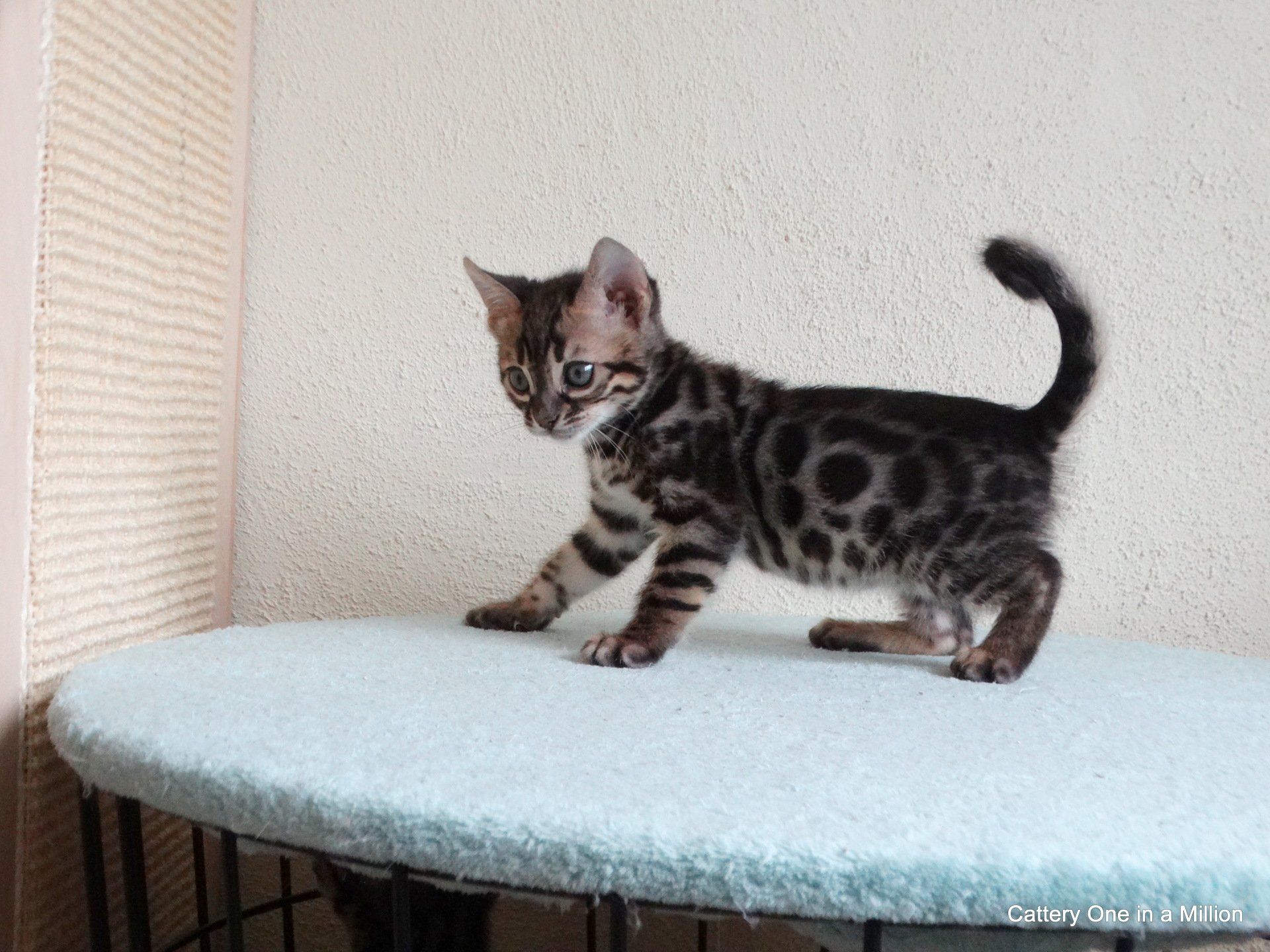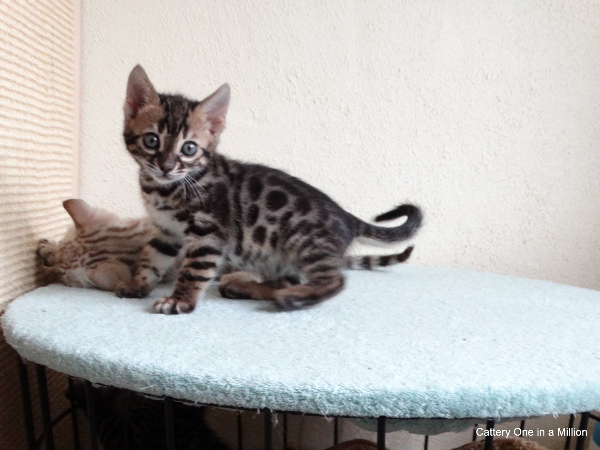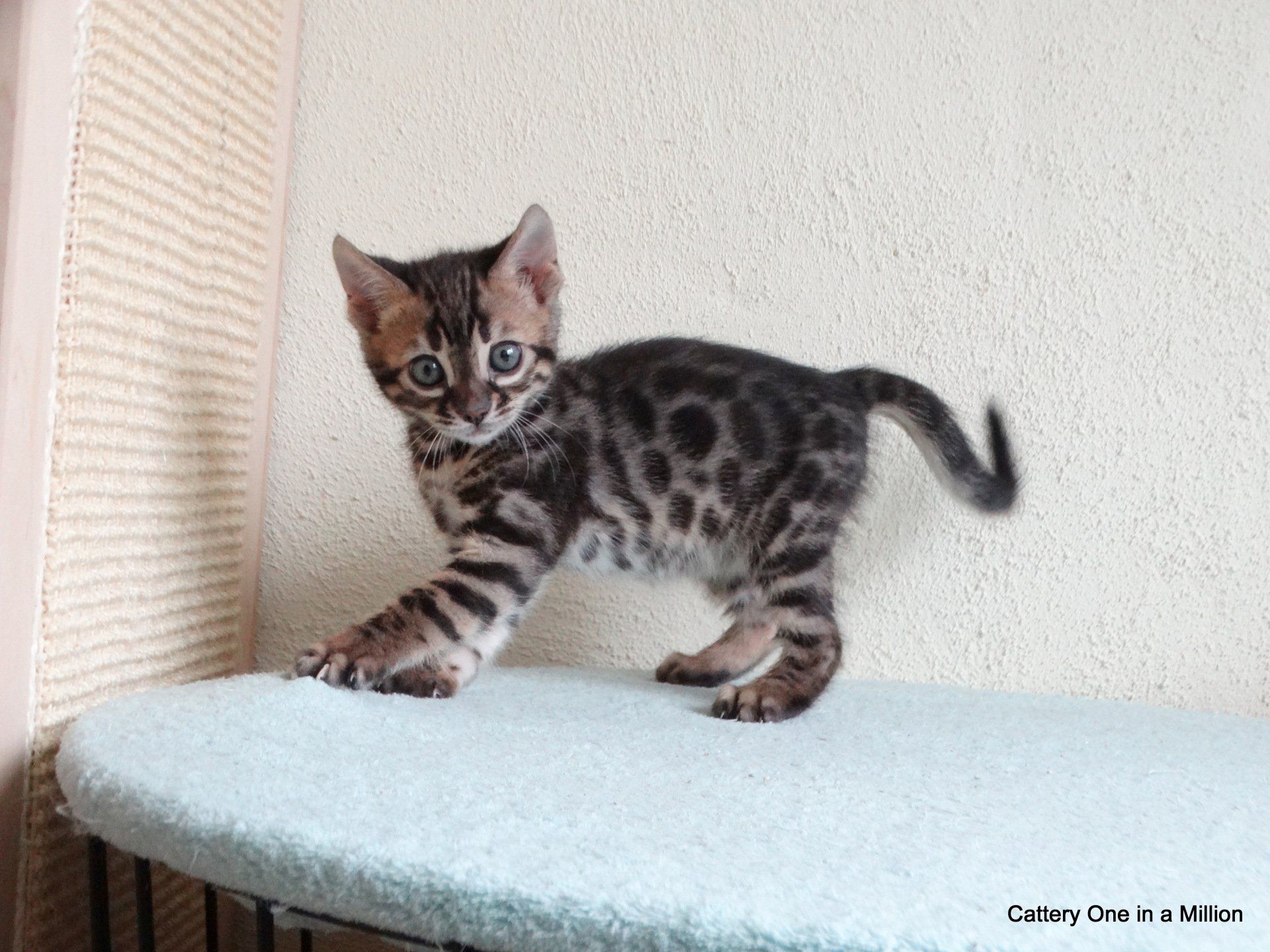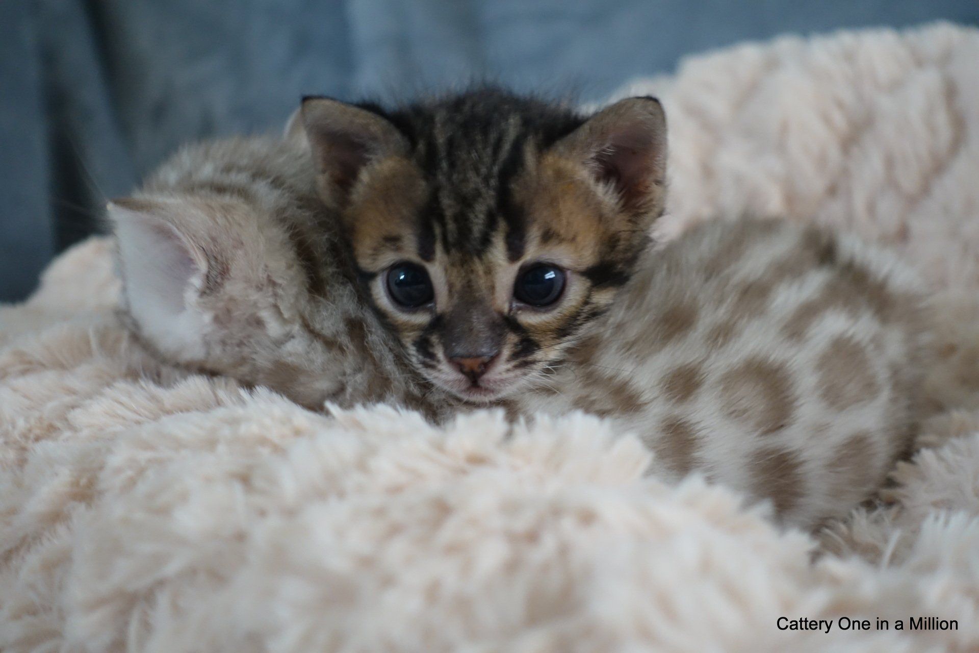 Nienna was born on 04-12-2019 by cesarean section Nienna is Black tabby Spotted/Rozetted in colour.Her tests : PKdef N/N HCM ?PKD/CIN ?FIV negativeFeLV negativePRA-b N/N via parentsThe parents are: Dam: One in a Million It Just Started with a WhisperBlack tabby spotted / Rozetted - Apb & lynx carrierFather: One in a Million Rare Bright TopazBlack Silver Tabby - Apb/Apb - sepia carrier