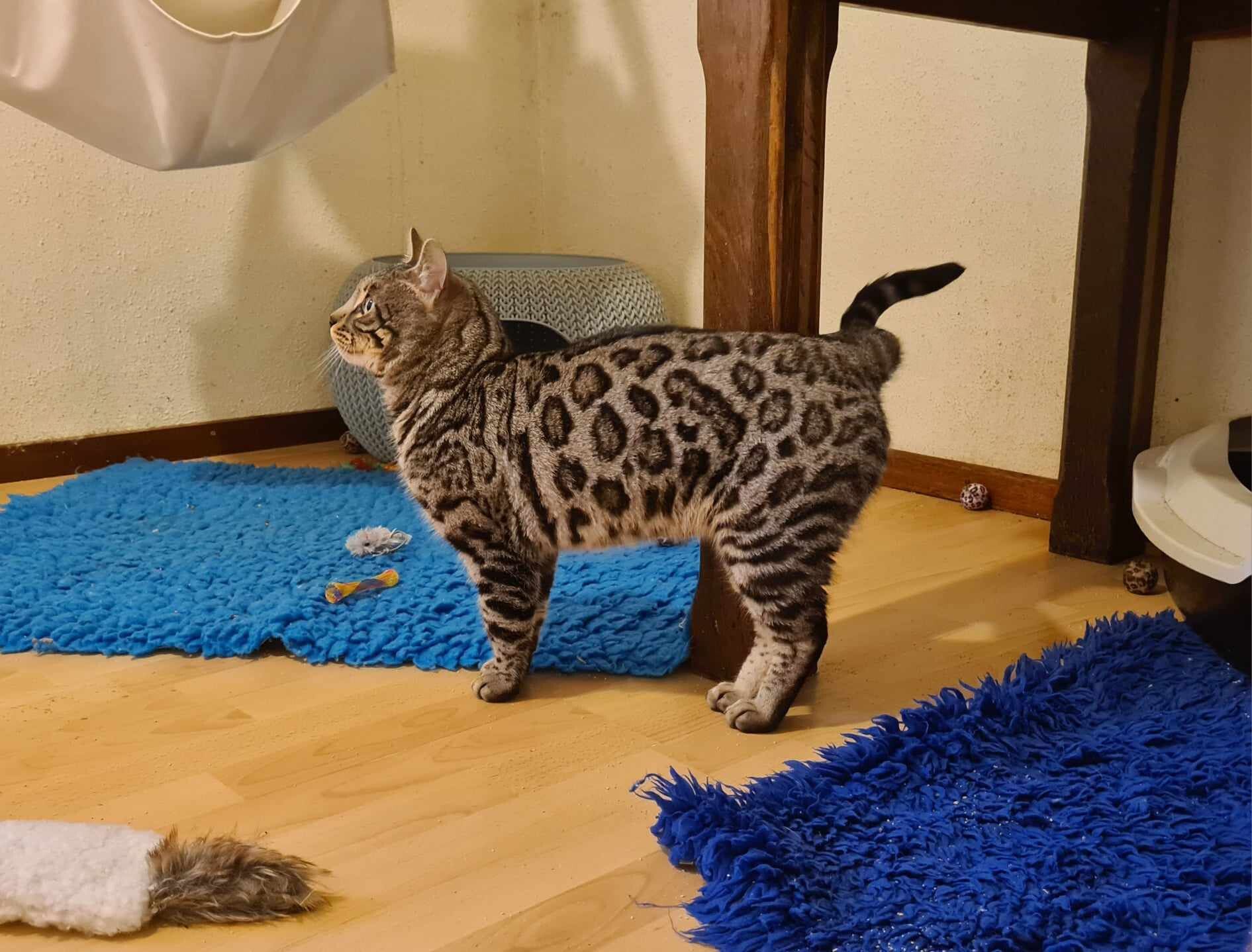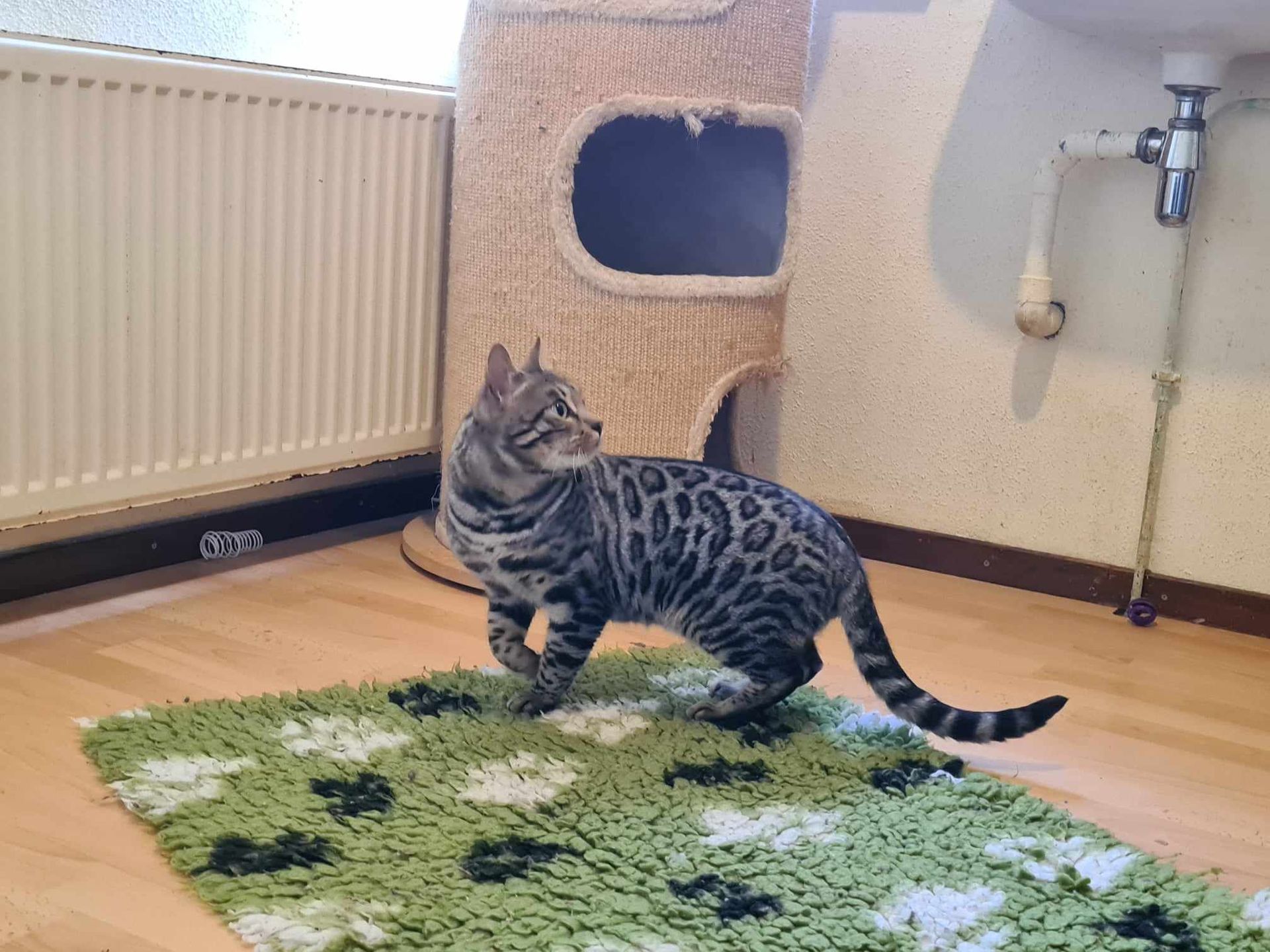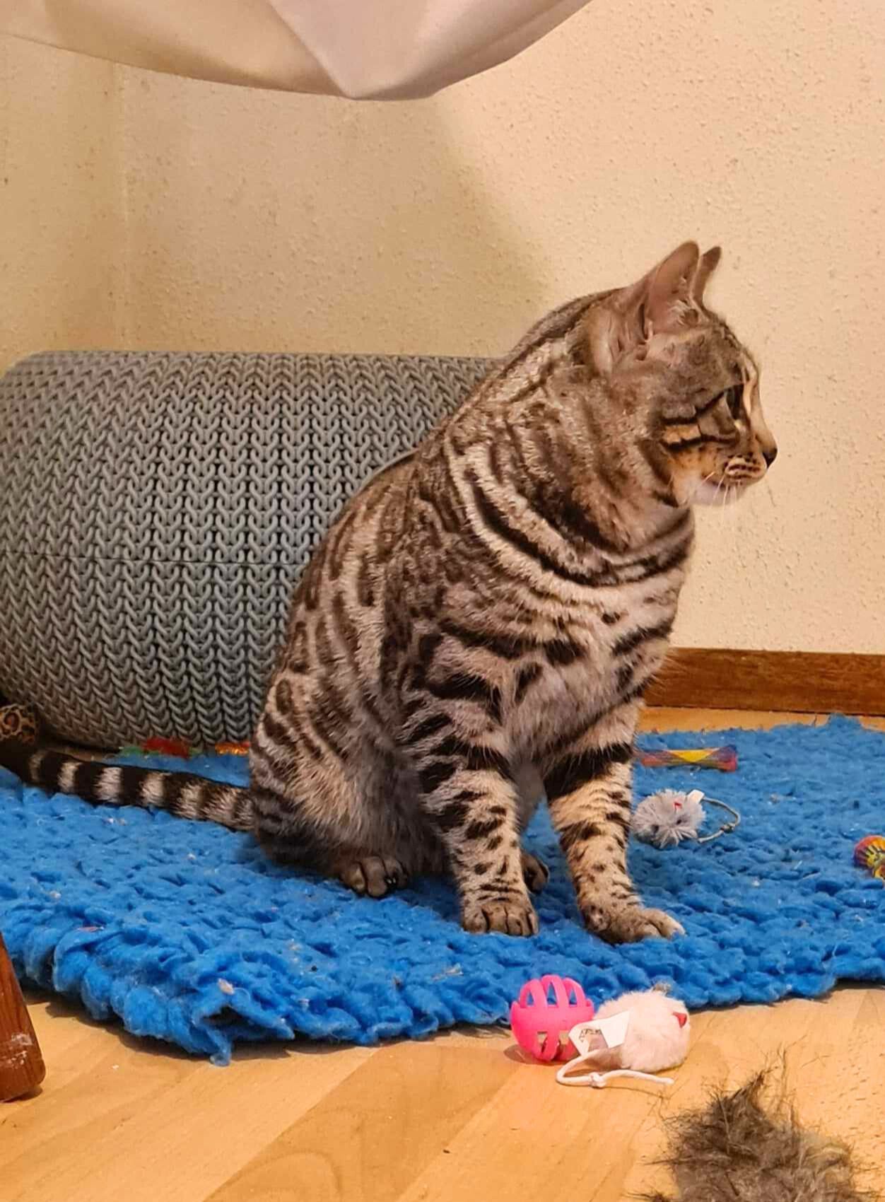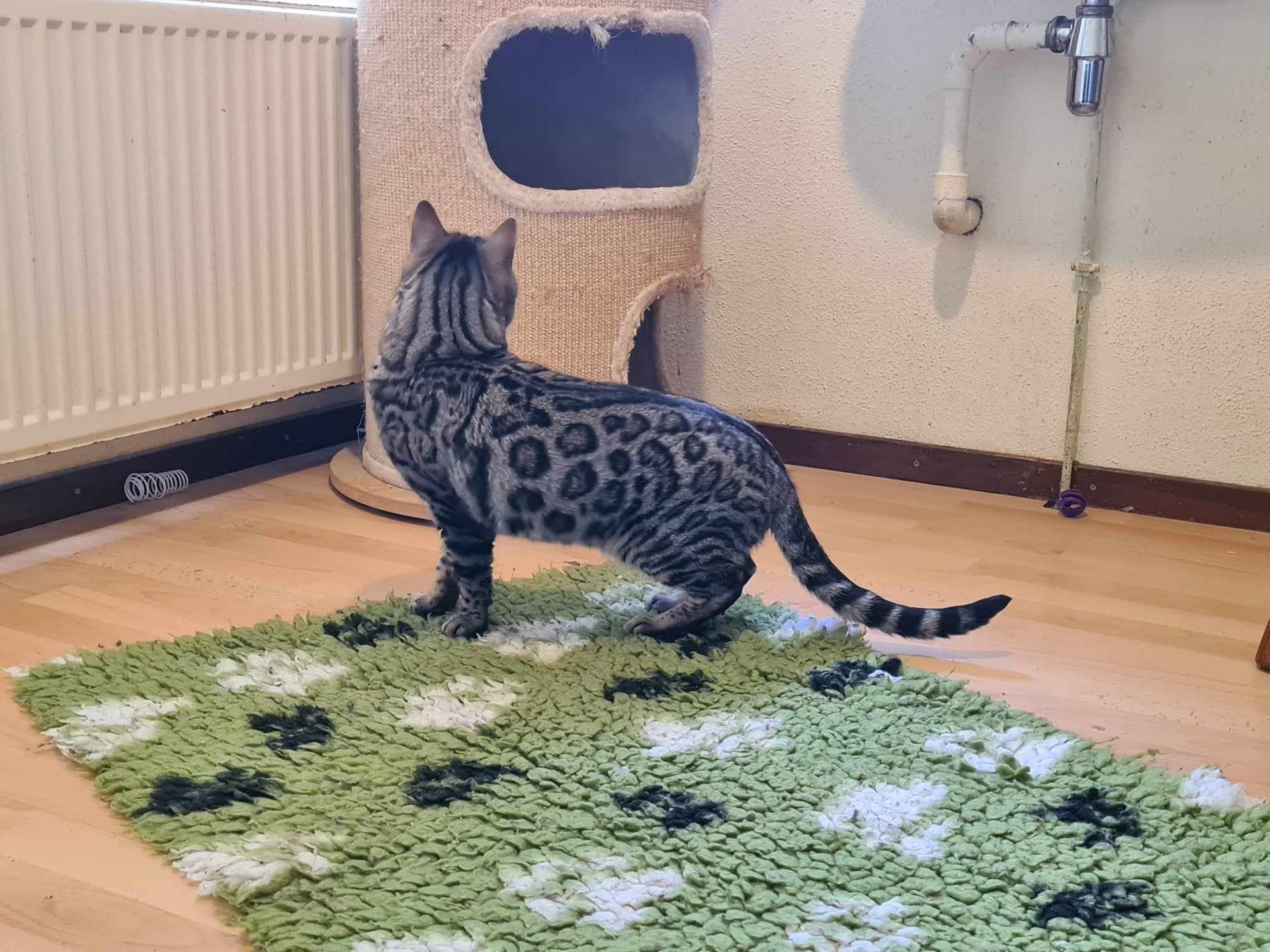 Black Silver Tabby spotted Carrier of Seal lynx born on 19.04.2022PKdef HCM Normal by ultrasound on 13.12.2024PKD/CIN Normal by ultrasound on 25.07.2023PRA-b FIV Negative 13.12.2024FeLV Negative 13.12.2024Parents: Mother: Britanniabengal 4Black tabby silver spotted tabby Father: Obelix MoniDworek*PL/FIseal lynx Twix recently came to live with us and luckily feels completely at home with us right away. He is really a big cuddler, a super nice character and sweet towards other cats.