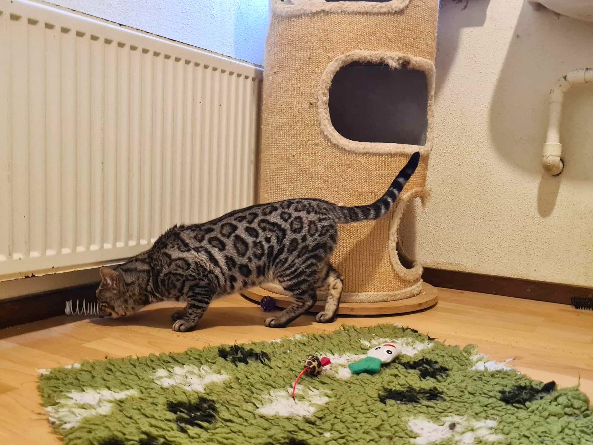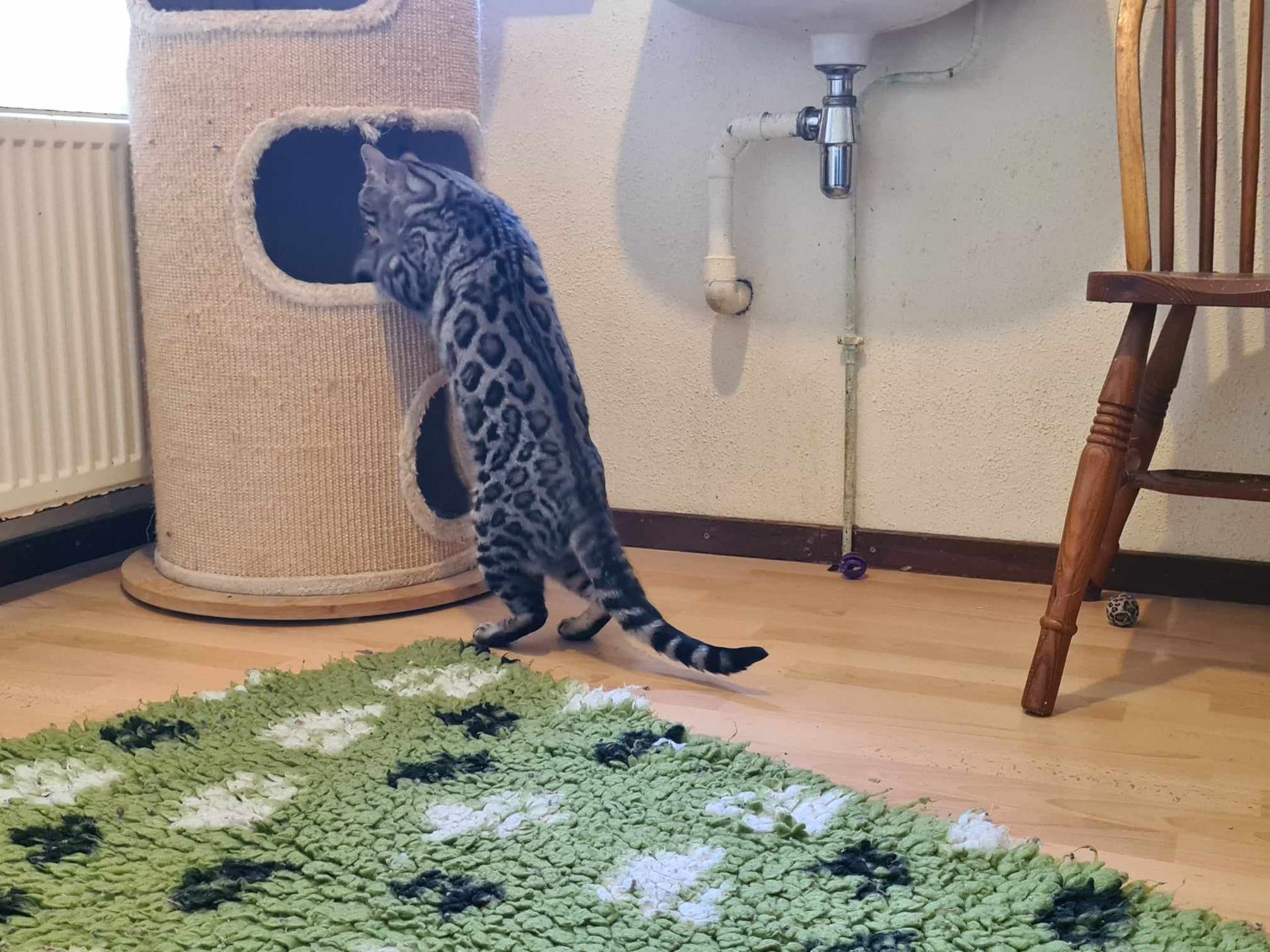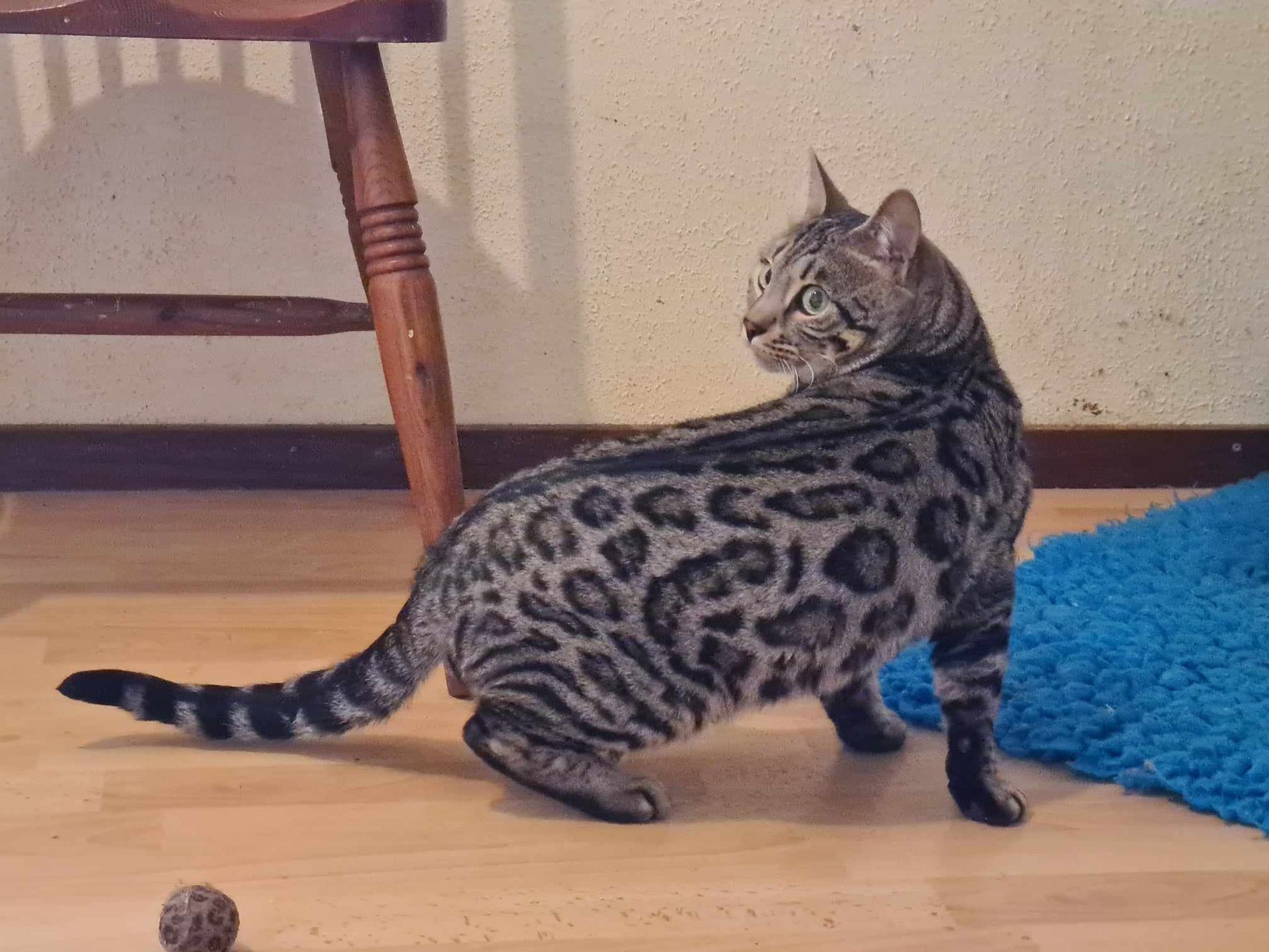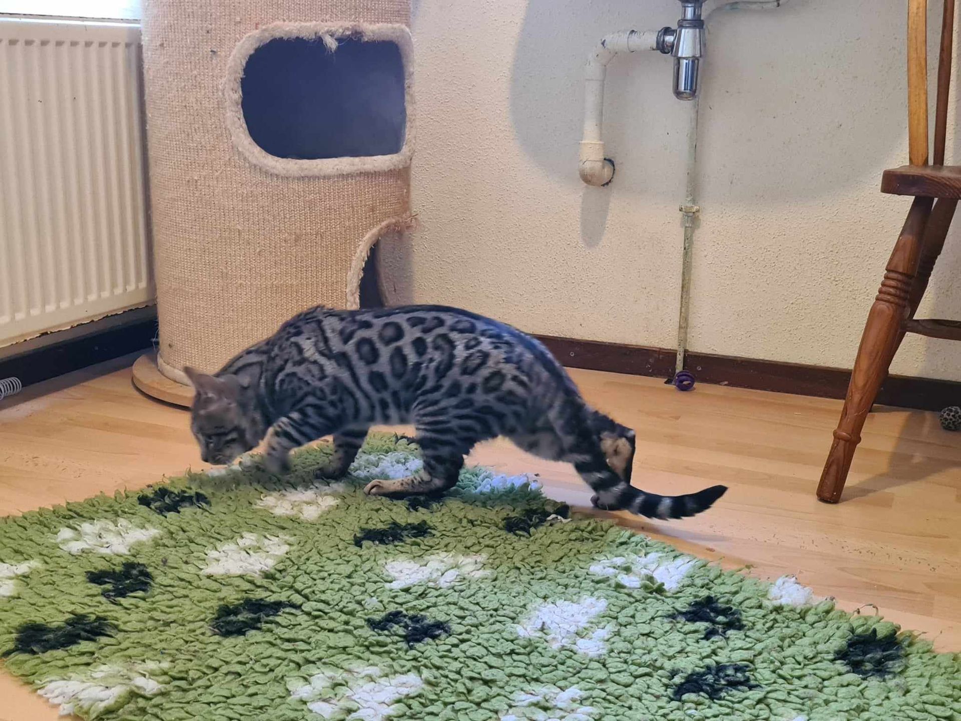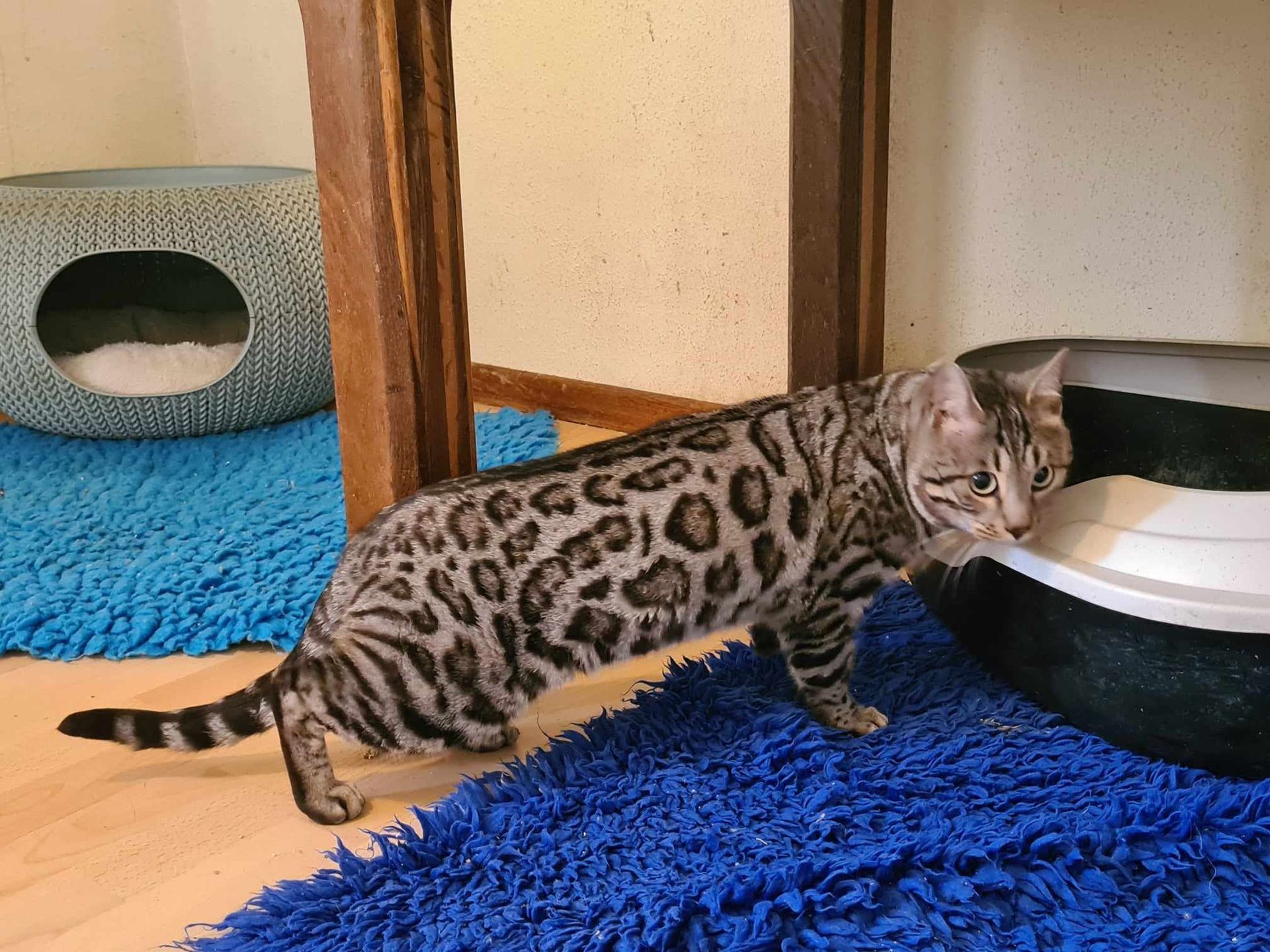 Black Silver Tabby spotted Carrier of Seal lynx born on 19.04.2022PKdef HCM Normal by ultrasound on 13.12.2024PKD/CIN Normal by ultrasound on 25.07.2023PRA-b FIV Negative 13.12.2024FeLV Negative 13.12.2024Parents: Mother: Britanniabengal 4Black tabby silver spotted tabby Father: Obelix MoniDworek*PL/FIseal lynx Twix recently came to live with us and luckily feels completely at home with us right away. He is really a big cuddler, a super nice character and sweet towards other cats.