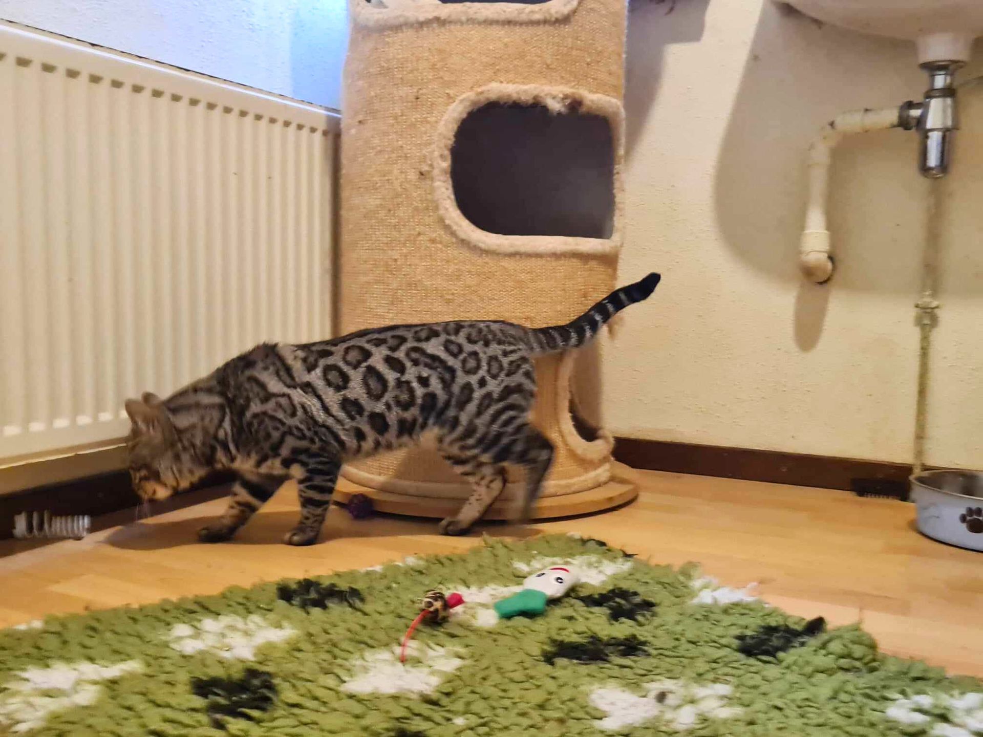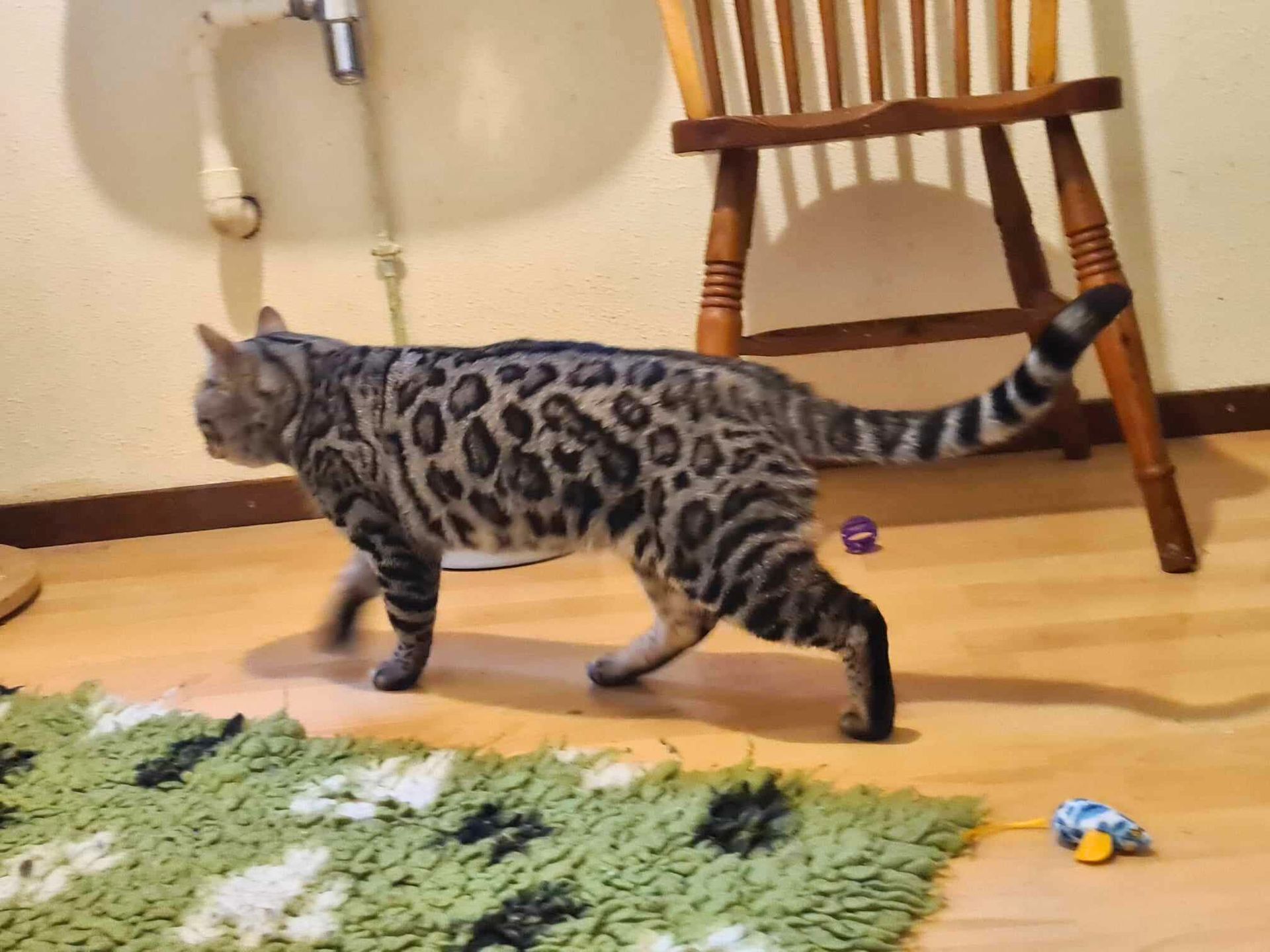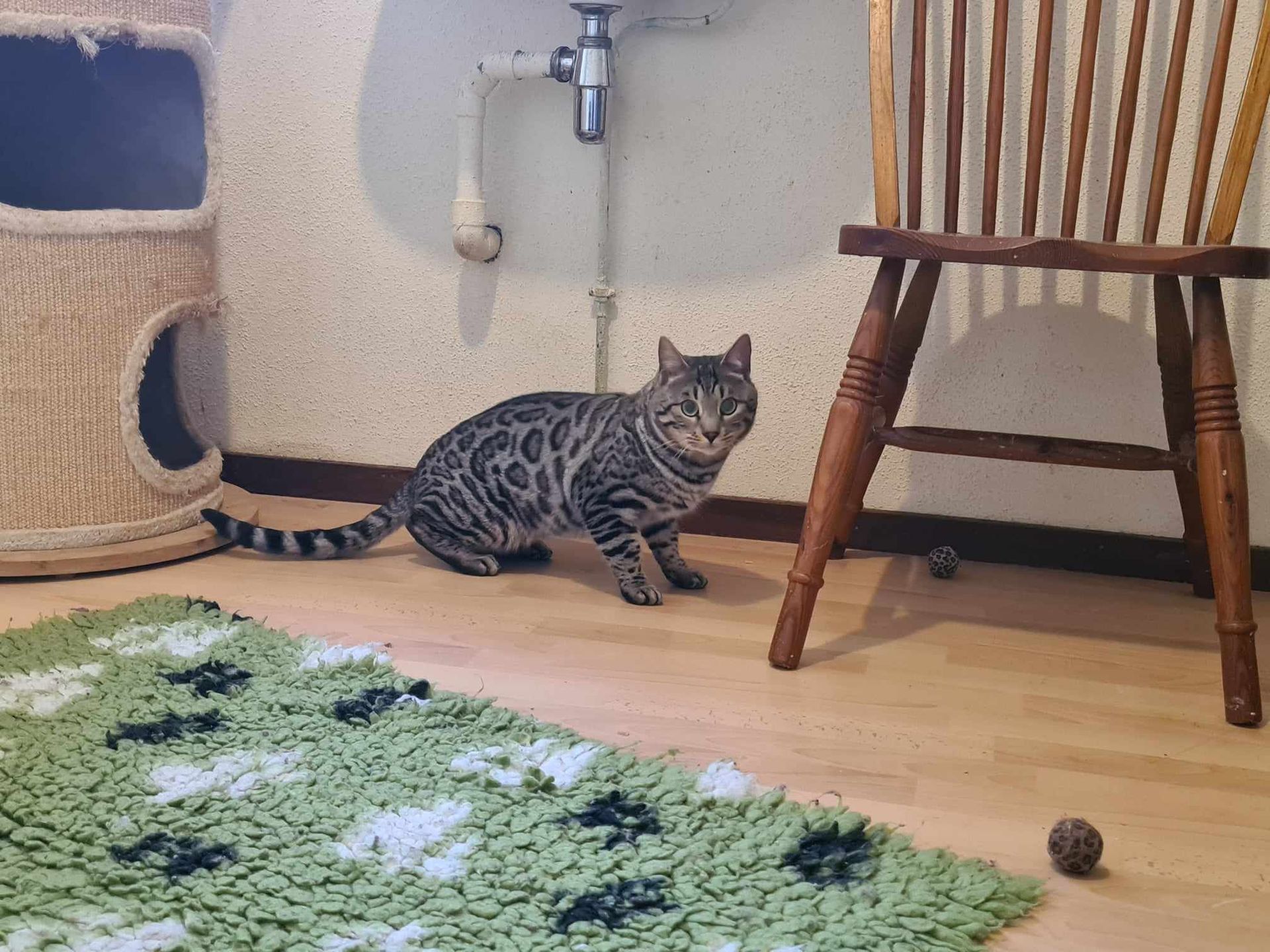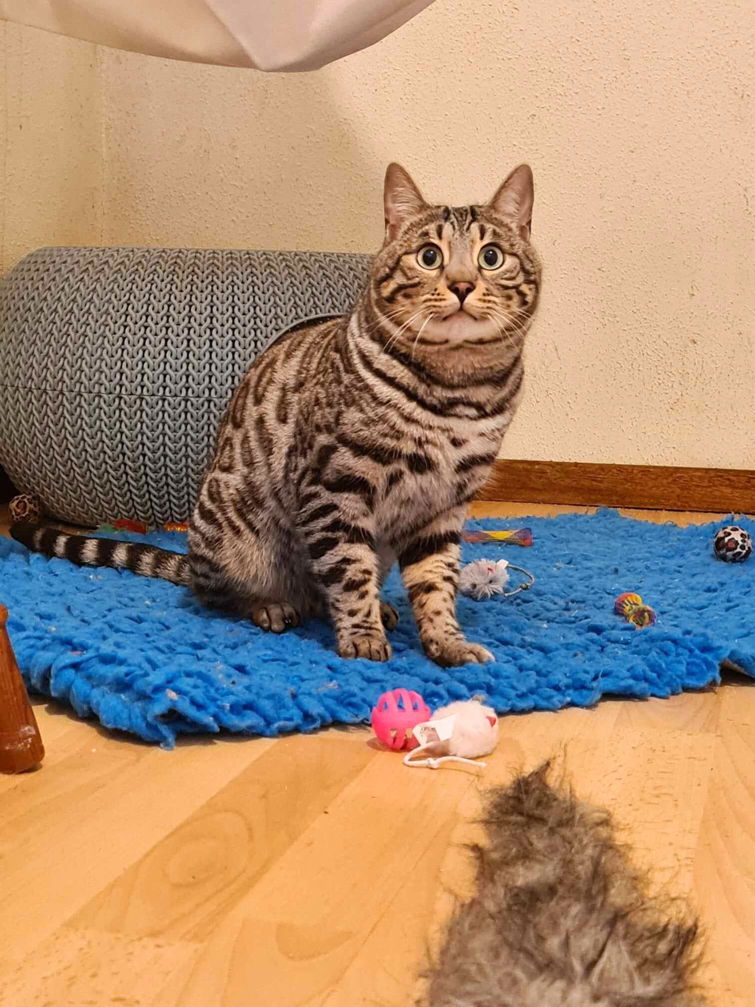 Black Silver Tabby spotted Carrier of Seal lynx born on 19.04.2022PKdef HCM Normal by ultrasound on 13.12.2024PKD/CIN Normal by ultrasound on 25.07.2023PRA-b FIV Negative 13.12.2024FeLV Negative 13.12.2024Parents: Mother: Britanniabengal 4Black tabby silver spotted tabby Father: Obelix MoniDworek*PL/FIseal lynx Twix recently came to live with us and luckily feels completely at home with us right away. He is really a big cuddler, a super nice character and sweet towards other cats.
