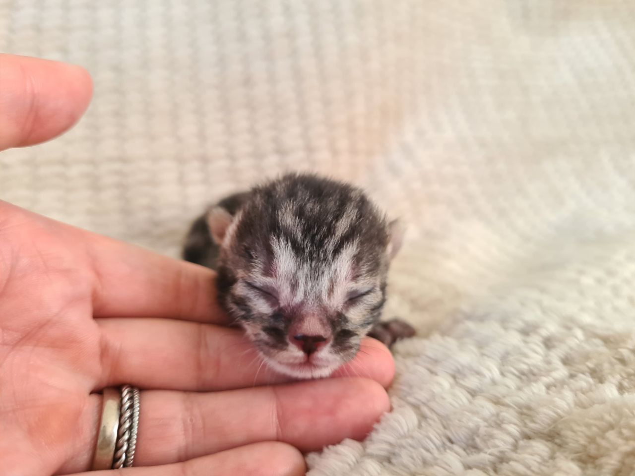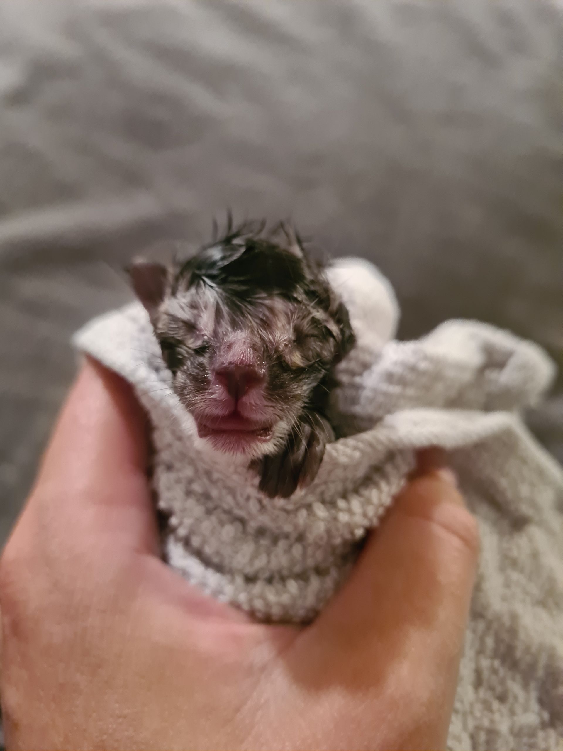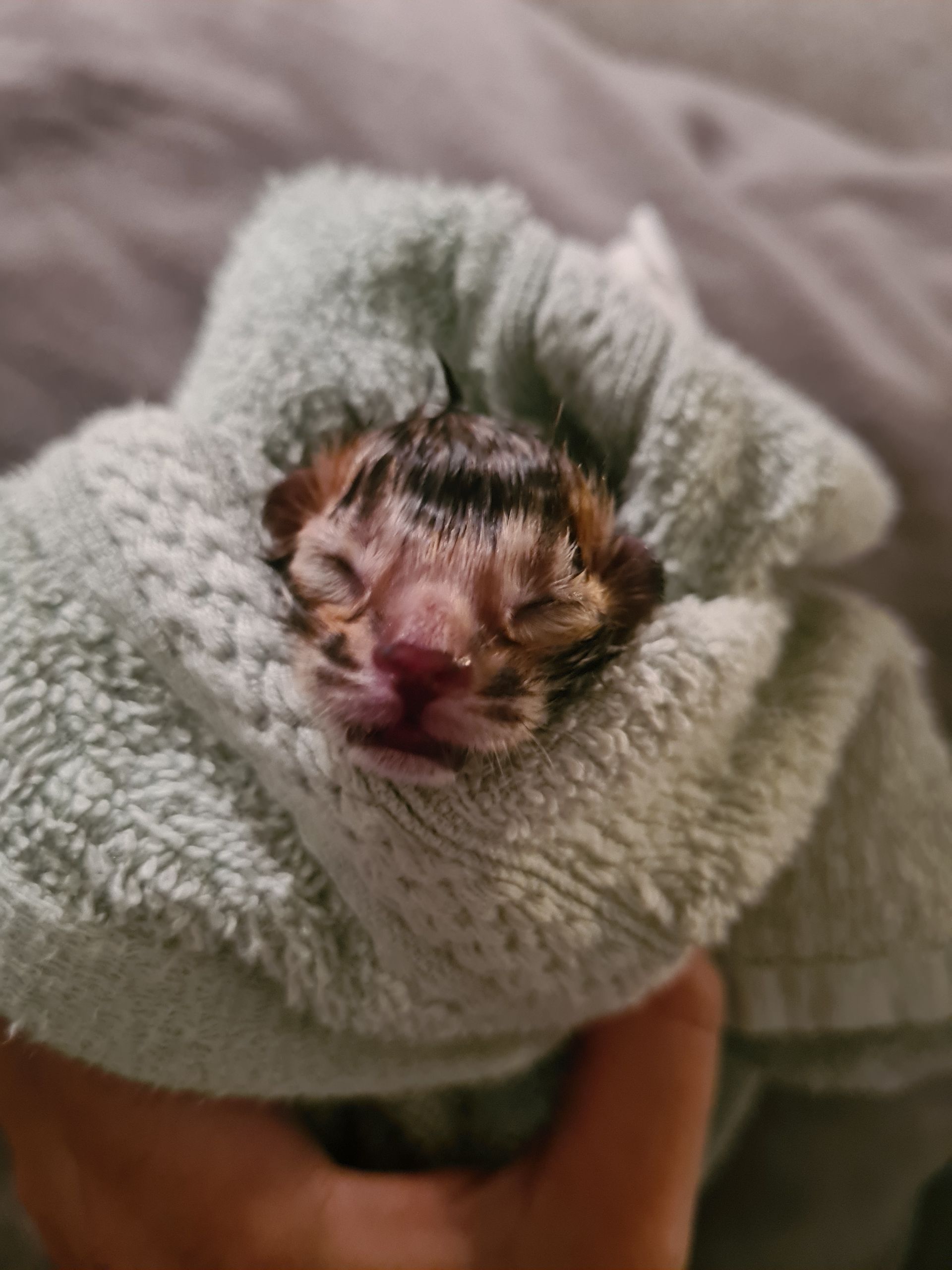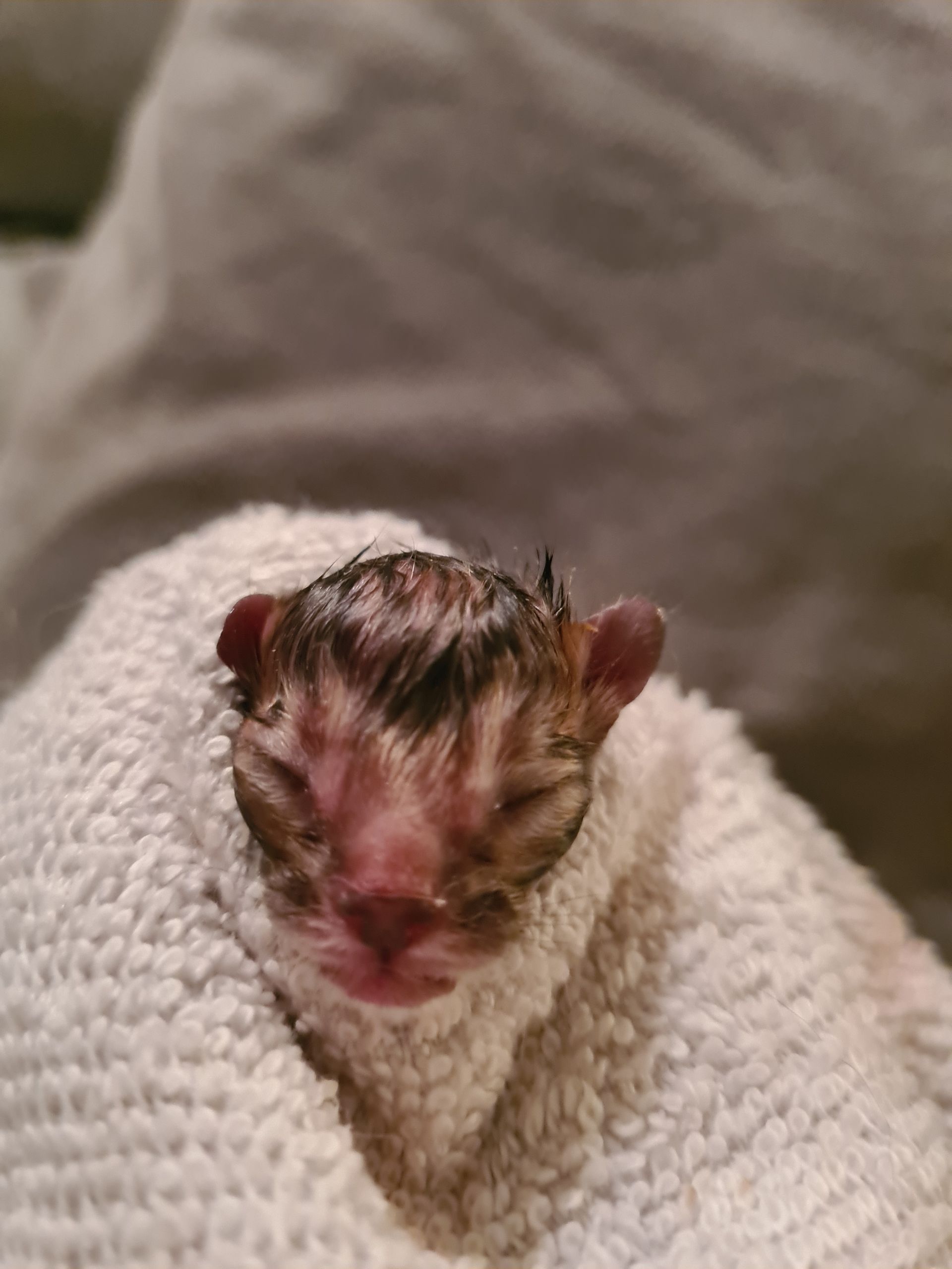 Het 1e kitten was een groot poesje die inderdaad in stuit ter wereld kwam. Het 2de kitten was opnieuw een poes in stuit deze ietsje kleiner. Het 3de kitten was duidelijk veel jonger, een piepklein katertje van slechts 54 gram. Nog helemaal roze maar hij maakte direct een sterke indruk.