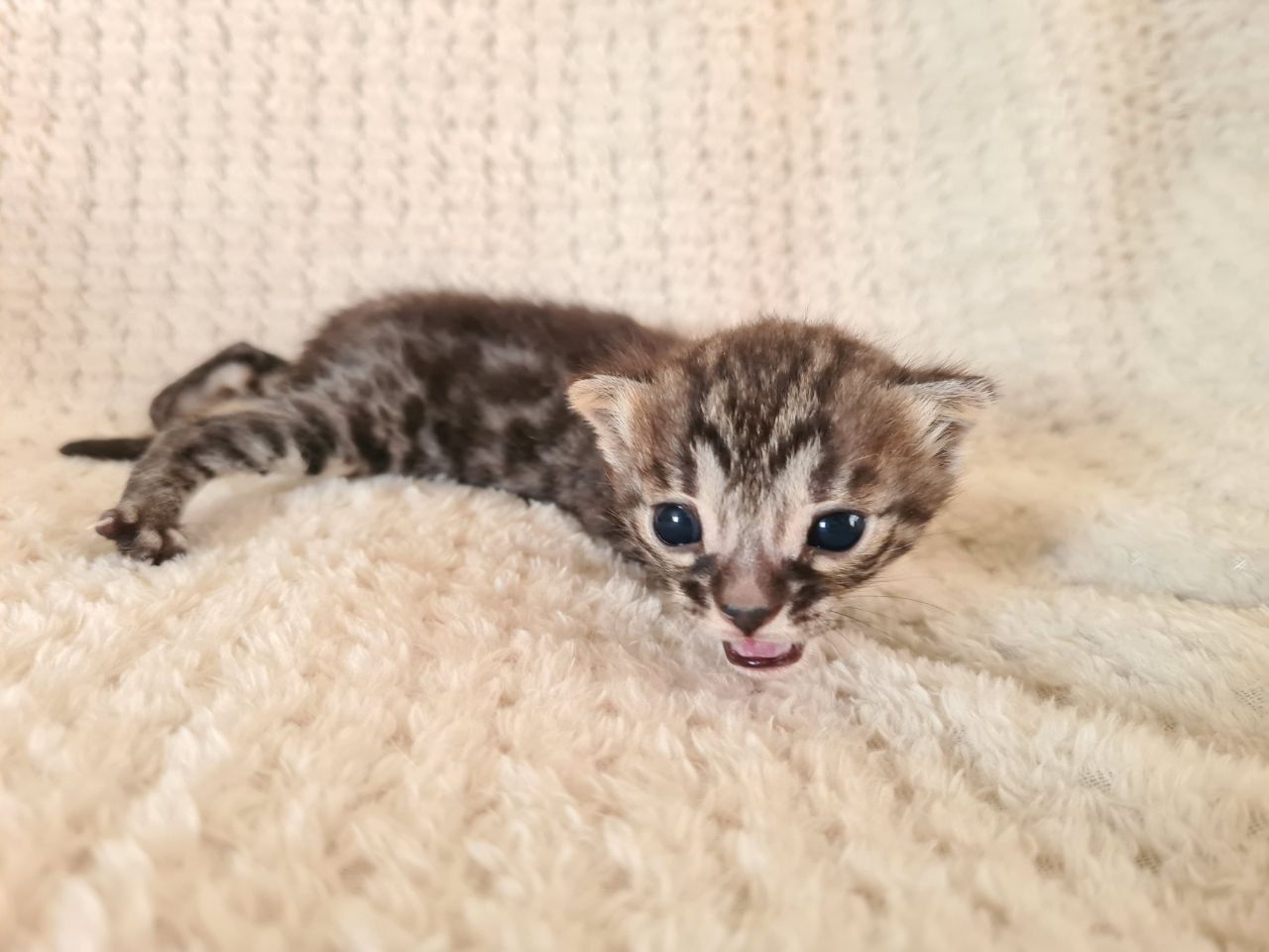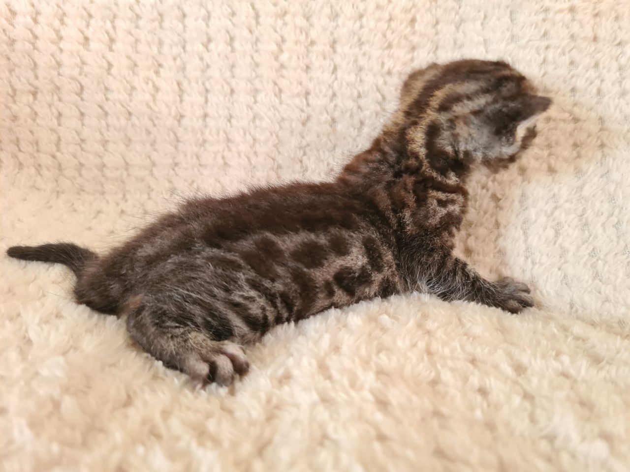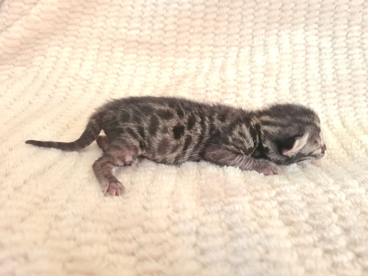 Het 1e kitten was een groot poesje die inderdaad in stuit ter wereld kwam. Het 2de kitten was opnieuw een poes in stuit deze ietsje kleiner. Het 3de kitten was duidelijk veel jonger, een piepklein katertje van slechts 54 gram. Nog helemaal roze maar hij maakte direct een sterke indruk.