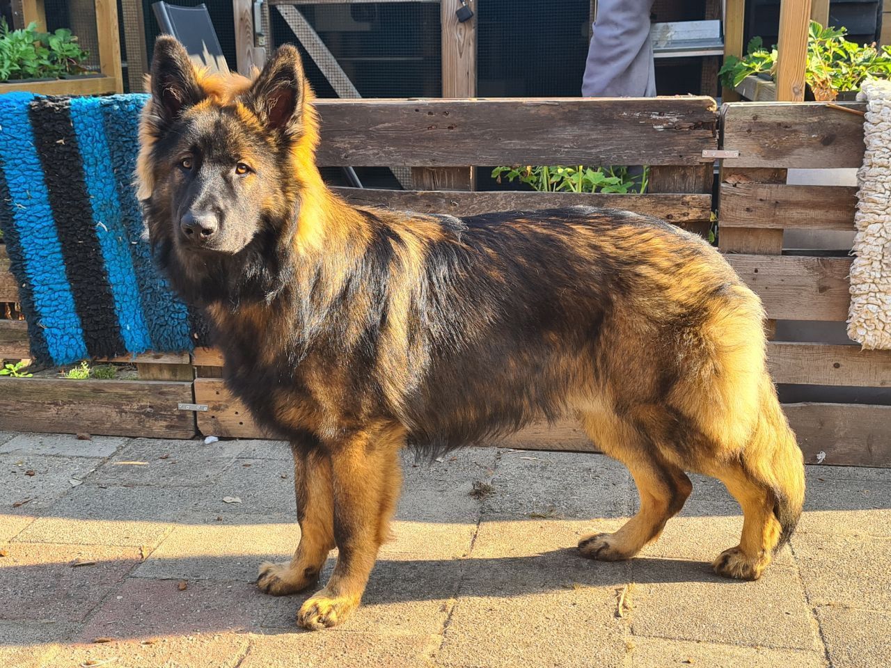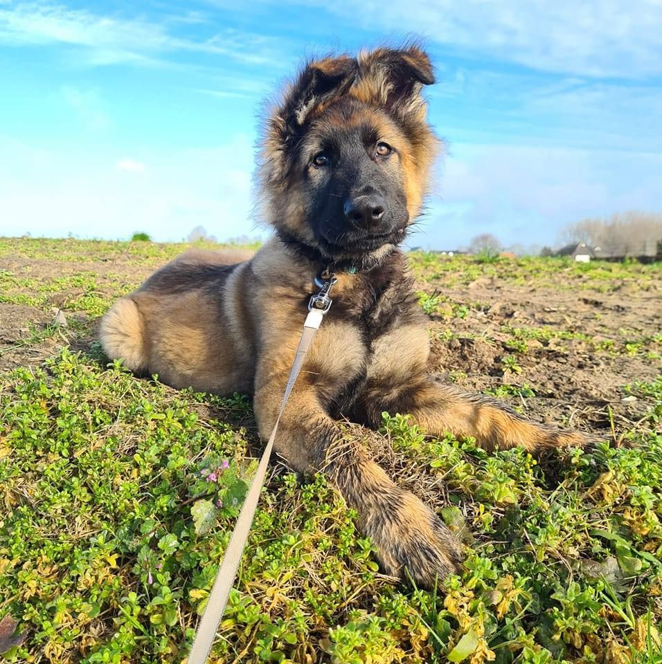 Hij is een wolfsgrauwe Oudduitse Herder.