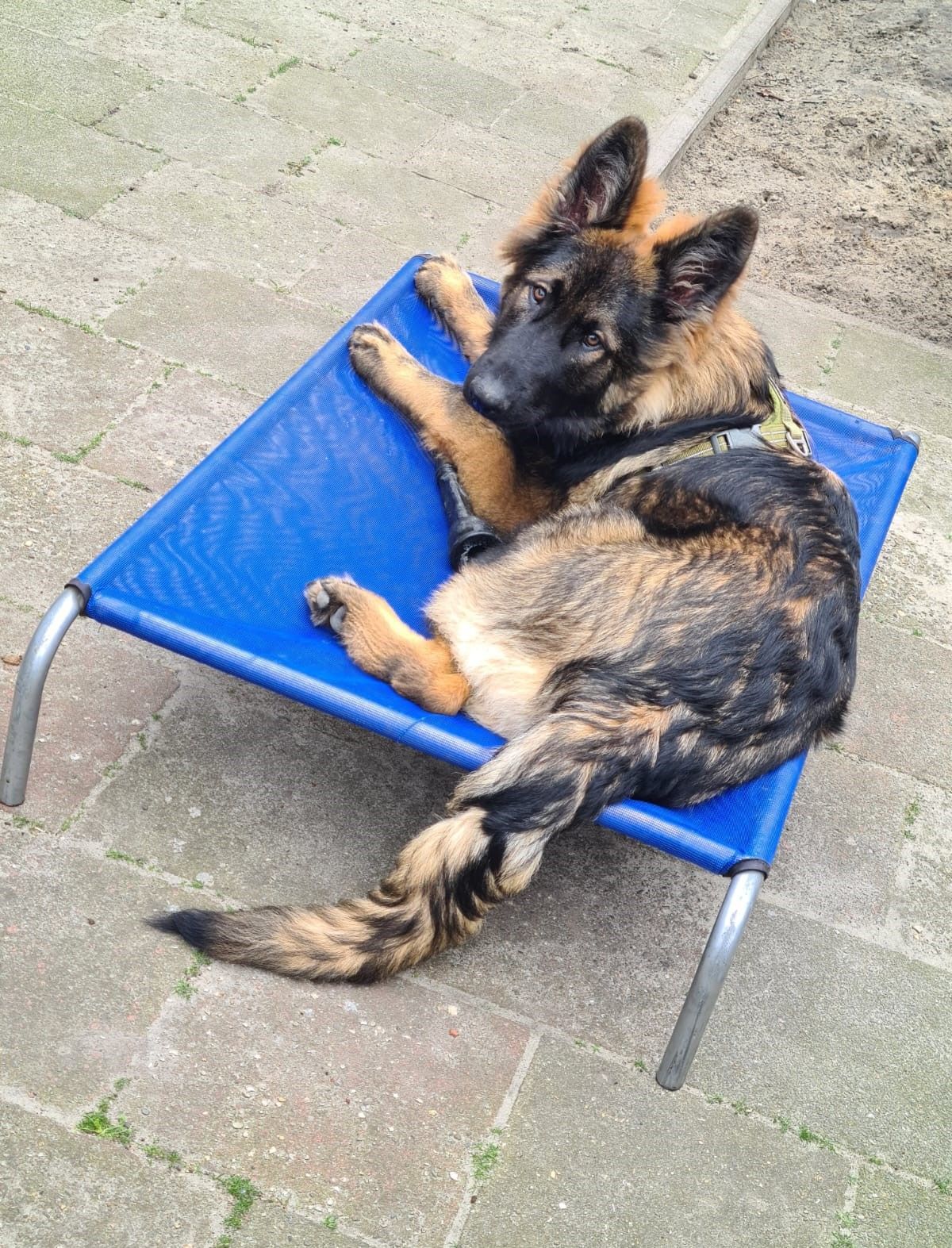 Het is wat zoeken naar een manier waarop hij prettig kan liggen. Het liefst ligt hij namelijk gewoon op de grond Wolf heeft het altijd te warm.