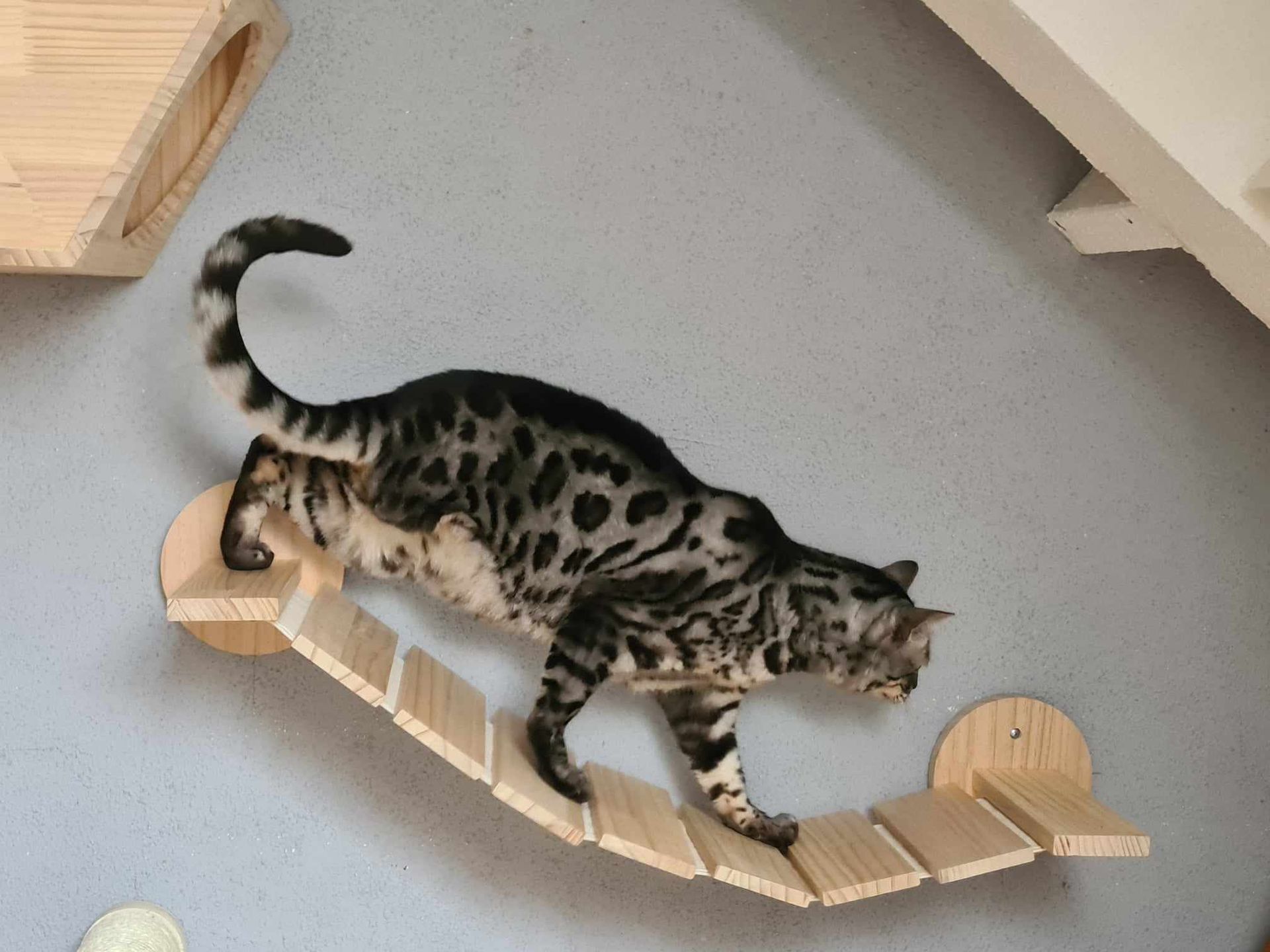 Nu hebben de katten een leuke klimwand met huisjes, bruggetjes, krabpaaltjes en opstapjes. Ze vinden het super leuk.